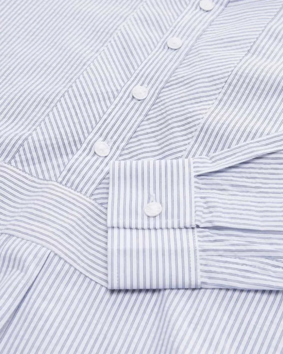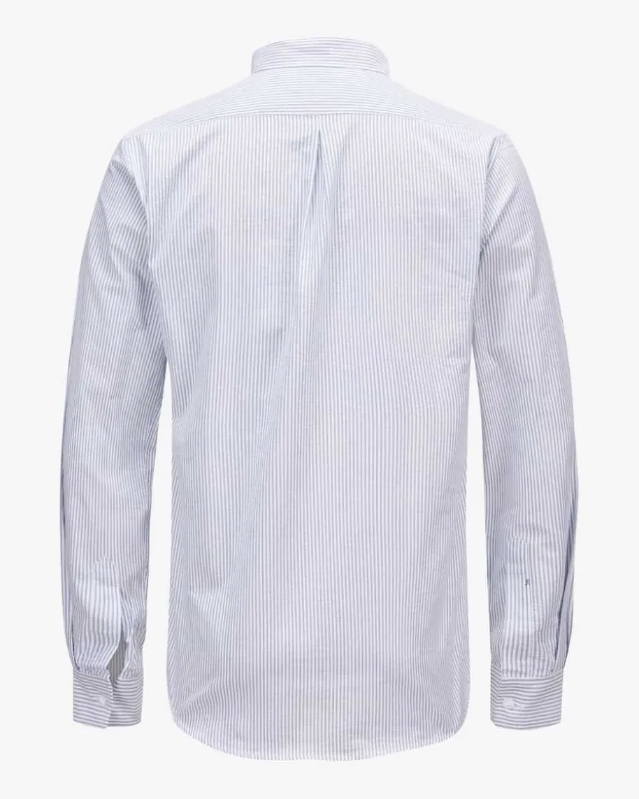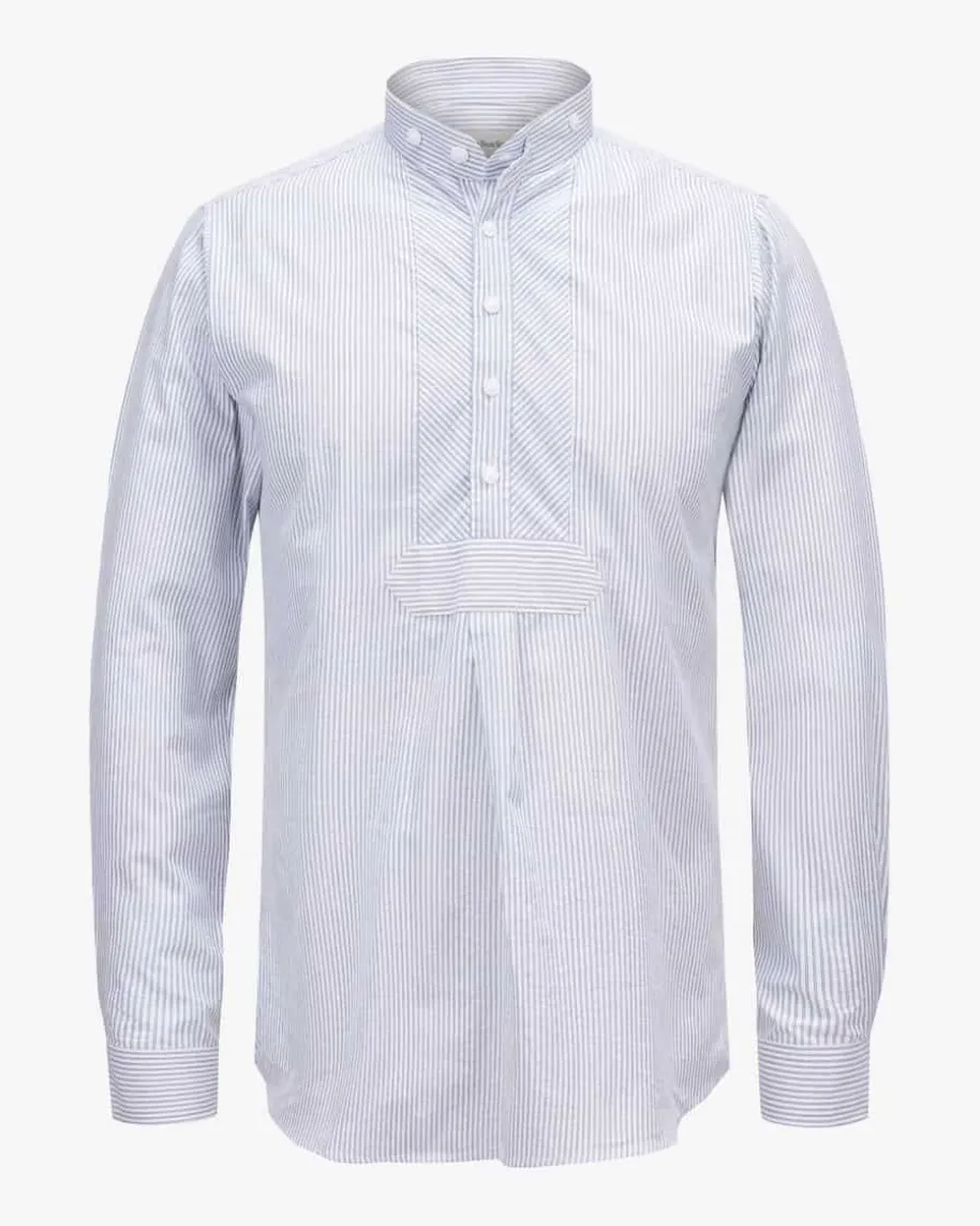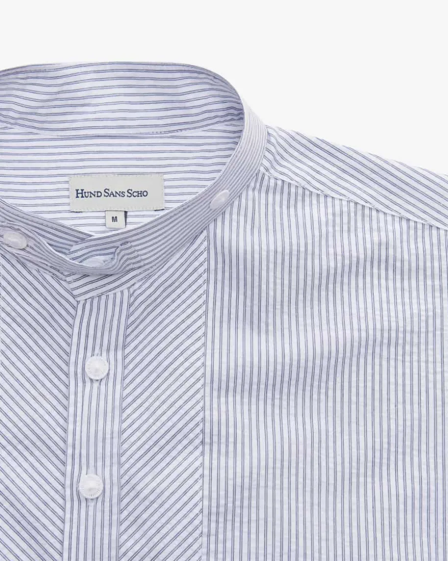 Trachtenhemd für Herren von Hund Sans scho in Weiß und Dunkelblau. Die beidenMünchner Freunde gründeten ihr Label um zeitgemäße Trachtenhemden mit demgewissen Etwas zu entwerfen, die leicht zu tragen sind und auf jedemOktoberfest- oder Volksfest-Besuch hohen Tragekomfort bieten. Dieses geradegeschnittene Sommer-Pfoad-Modell besticht durch die dezente Seersucker-Aufmachung mit einem leichten Tragegefühl und verleiht zusammen mit demStreifenmuster einen modernen Charakter.