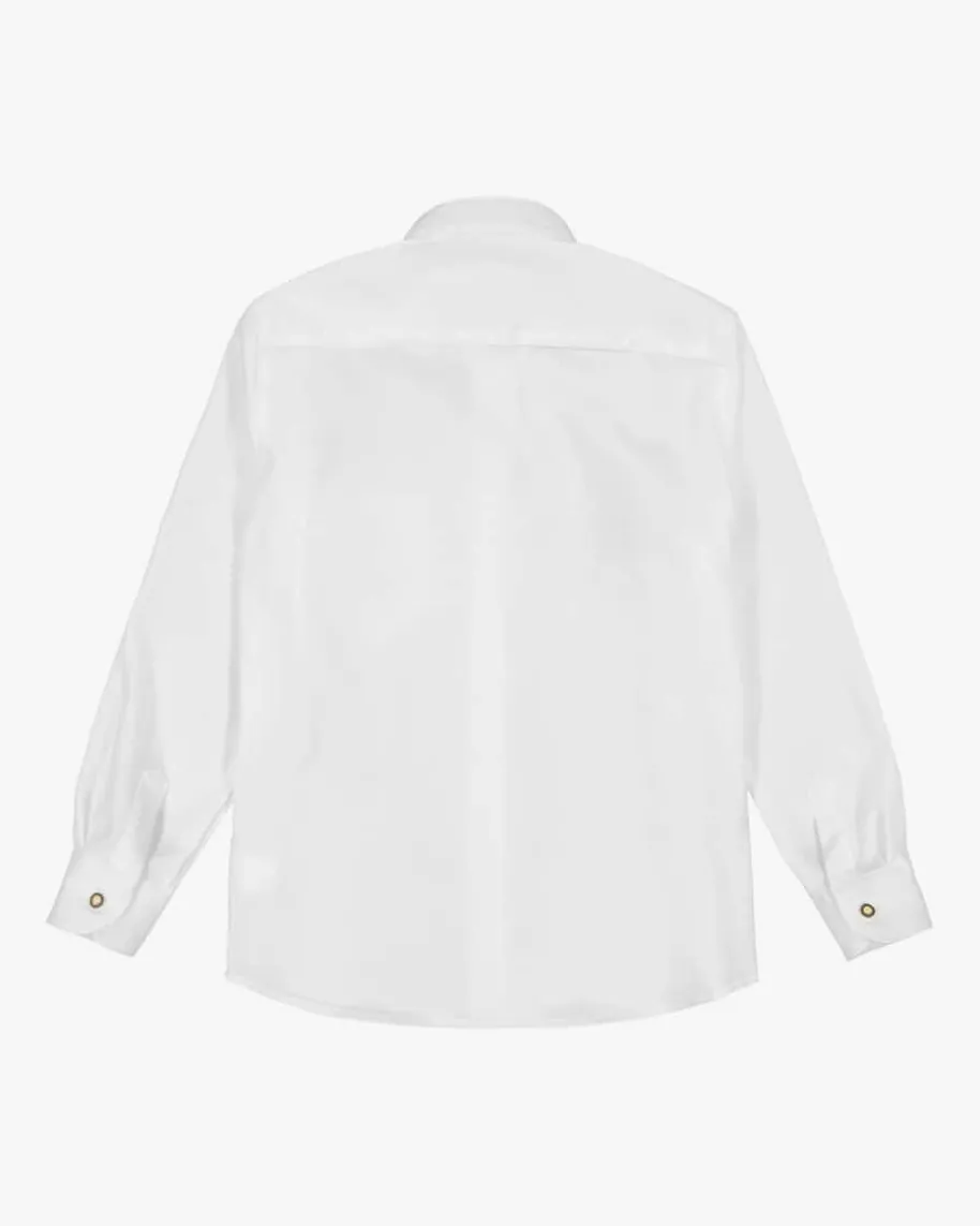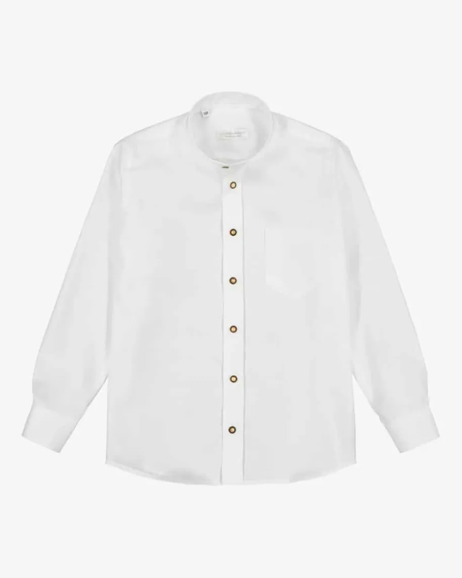 Jungen-Trachtenhemd von Gloriette in Weiß. Das gerade geschnittene Modellpräsentiert sich mit klassischen Details wie den Hornknöpfen und derBrusttasche. Die sonst schlichte Aufmachung ergänzt das traditionelle Gesamtbildgekonnt.