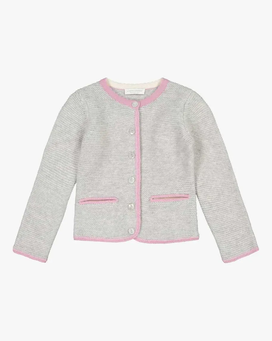 Mädchen-Trachtenstrickjacke von LODENFREY in Hellgrau und Rosa. DieStrickjacke aus feiner Woll-Cashmere-Qualität besticht durch besonders angenehmeTragemomente sowie die traditionelle Aufmachung. Raffinierte Kontrast-Paspelierungen und das klassische Strickmuster verleihen dem taillierten Modelleine niedlich, rustikale Note.