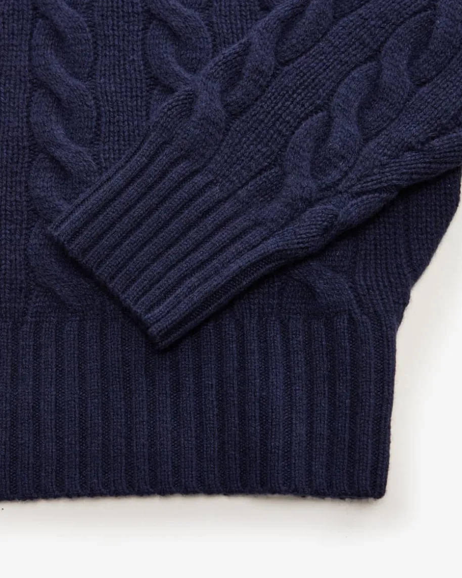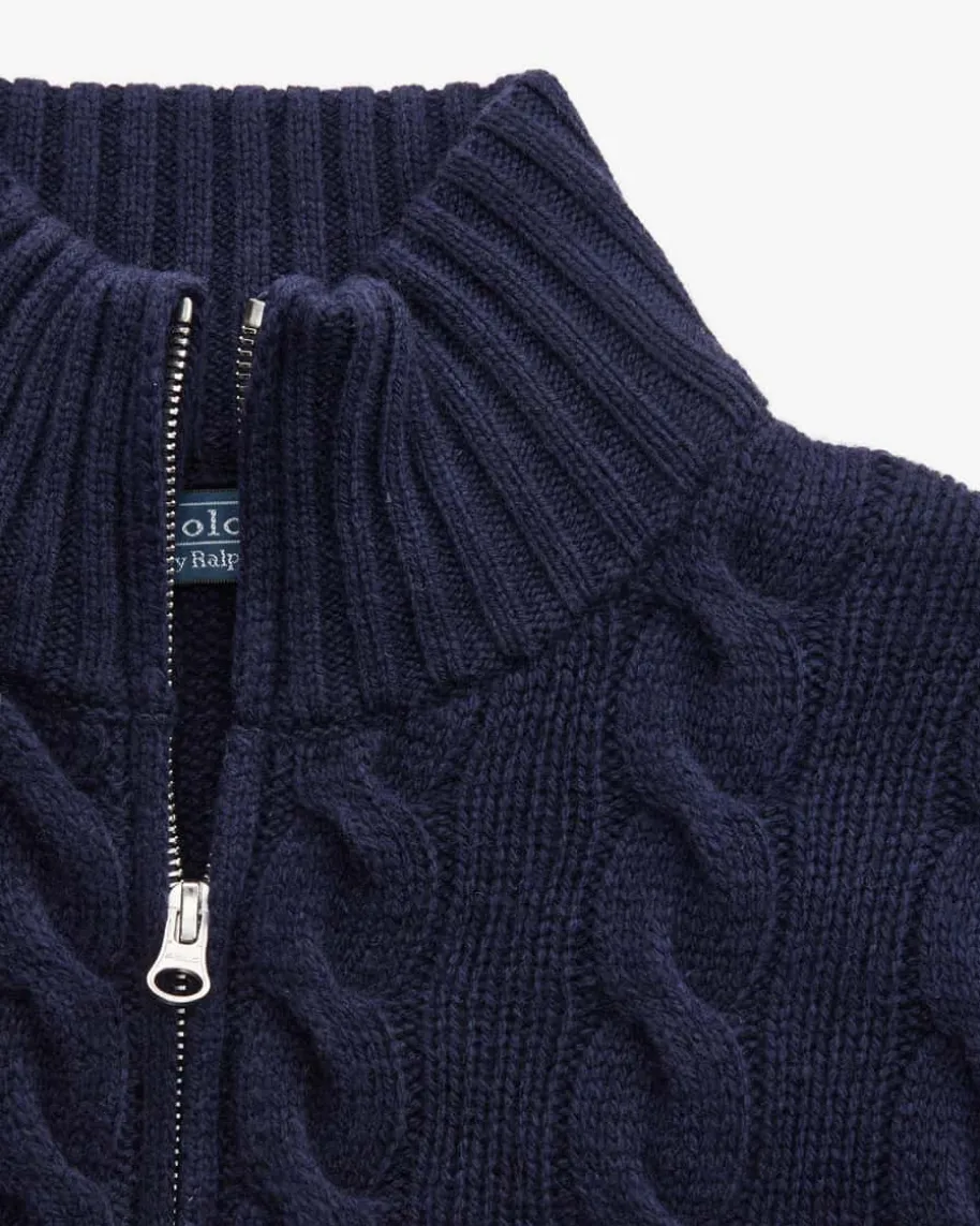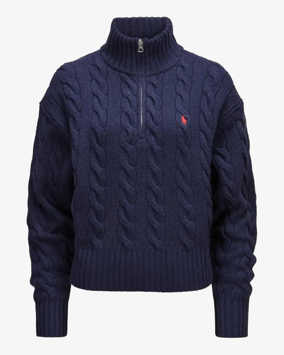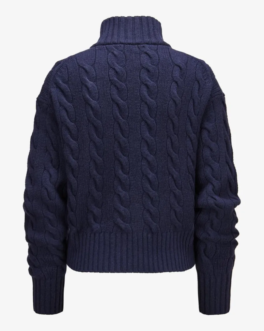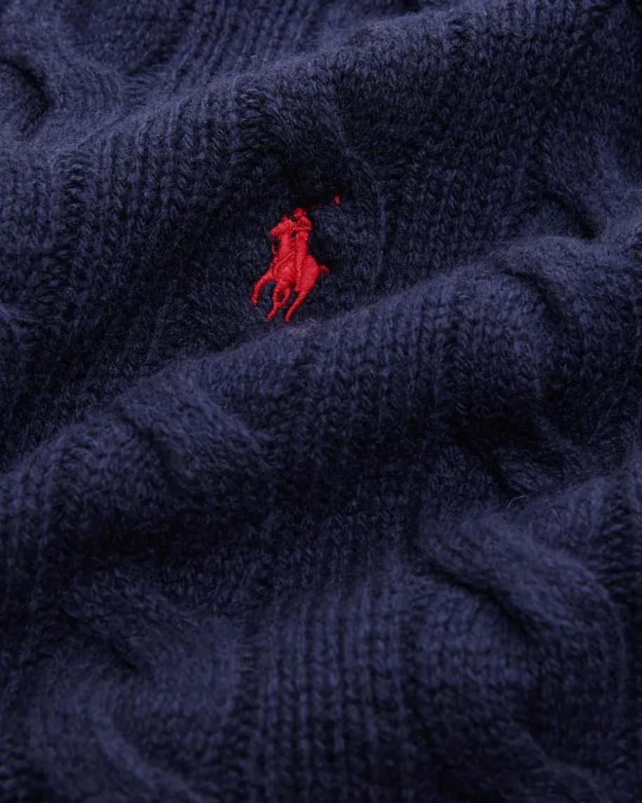 Troyer für Damen von Polo Ralph Lauren in Navy. Das Modell präsentiert sich dankcharakteristischem Zopf-Strickmuster in Verbindung mit dem Troyer-Kragen mitmodernem Charakter, während die hochwertige Woll-Cashmere-Qualität einenangenehm-weichen Griff verspricht.