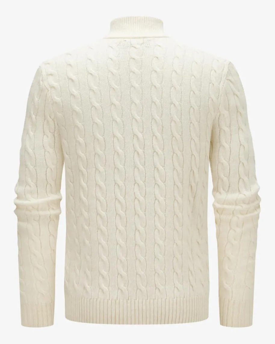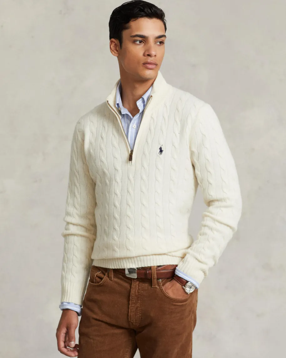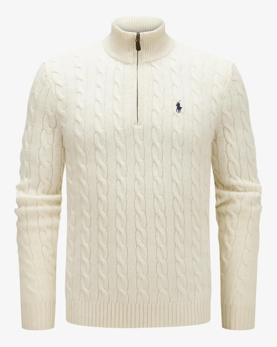 Troyer für Herren von Polo Ralph Lauren in Creme. Das Modell besticht dank derhochwertigen Woll-Cashmere-Qualität sowie dem modischen Zopf-Muster mitangenehmen Tragemomenten, während der Troyer-Kragen das Gesamtbild gekonntuntermalt. Zugleich rundet die tonale Logo-Stickerei auf Brusthöhe den Looklabeltypisch ab.