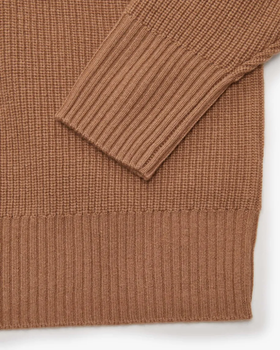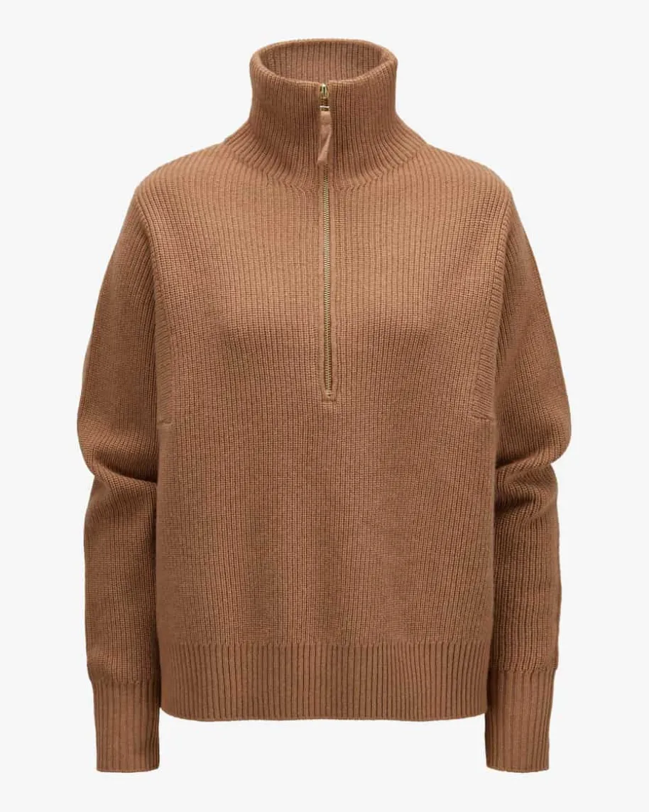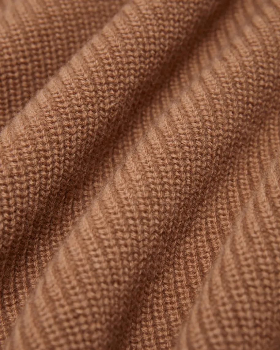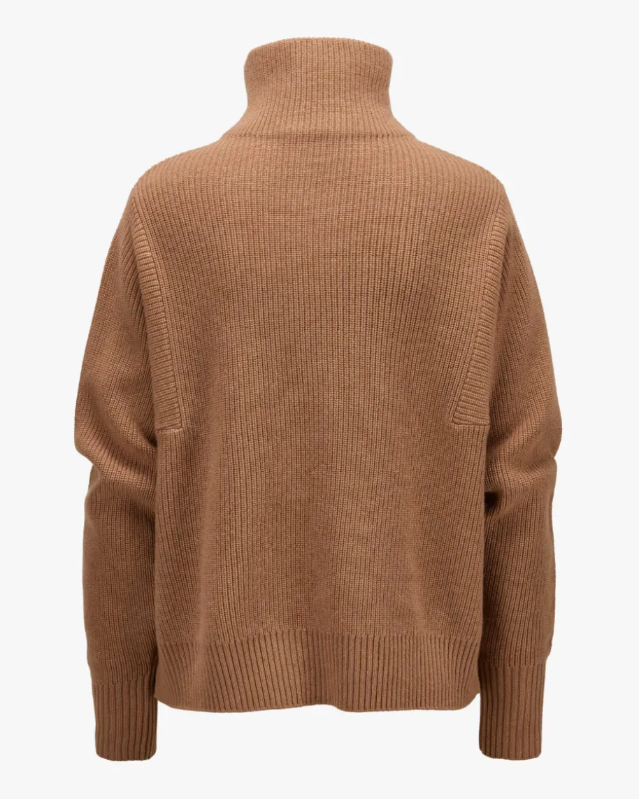 Troyer für Damen von handmade in Camel. Auch dieses weit geschnittene Modell mitextravaganter Nahtführung begeistert mit weicher Strick-Verarbeitung ausleichtem Woll-Cashmere-Mix, der für angenehmen Tragekomfort sorgt. Der Troyer-Kragen sowie die Rippstrick-Struktur kreieren einen modernen Casual-Begleitermit sportivem Touch.