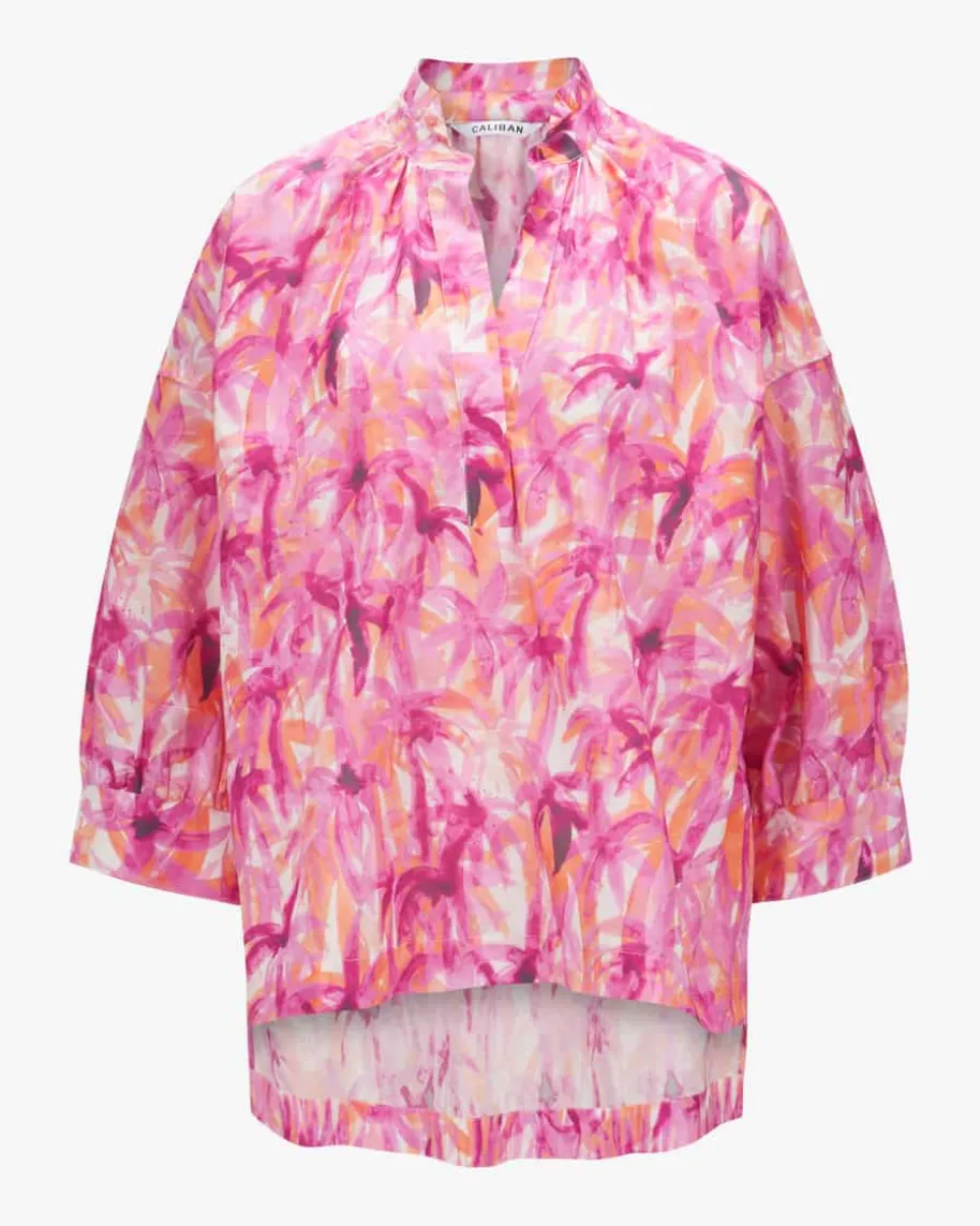 Tunikabluse für Damen von Caliban in Pink, Orange und Weiß. Das Modell punktetmit leichter Baumwoll-Qualität und lockerem Tunika-Schnitt, wodurch einsommerlicher Begleiter mit Stil geschaffen wird. Das aquarellige Allover-Dessinmit Palmen-Motiv rundet den Gesamt-Look gekonnt ab.