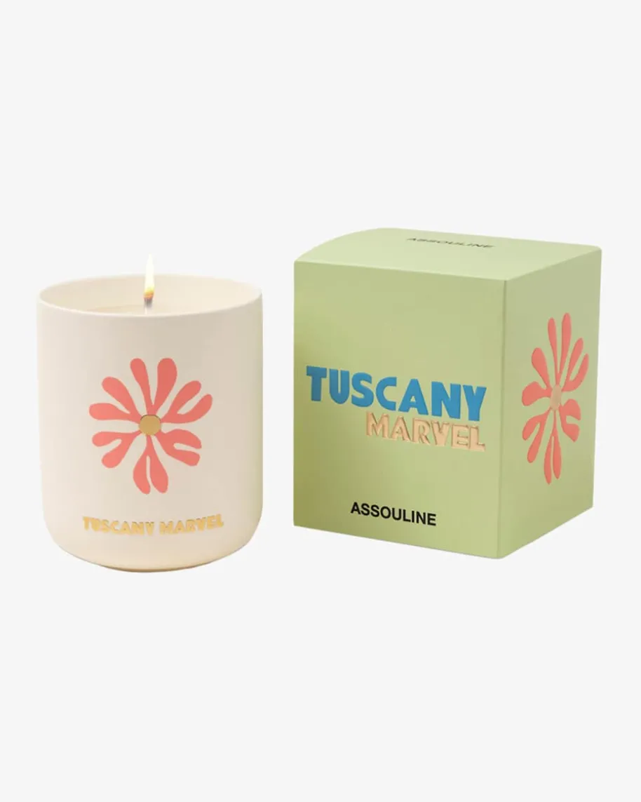 Tuscany Marvel Kerze von Assouline. Travel from Home – Präsentiert in einemdekorativen Keramikgefäß, fängt der Duft dank der knackigen Mischung ausBasilikum, schwarzem Pfeffer, Tomatenblättern, Bambus, Cassis und Bernstein dasunbeschwerte und zugleich genussvolle La Dolce Vita-Lebensgefühl perfekt ein.