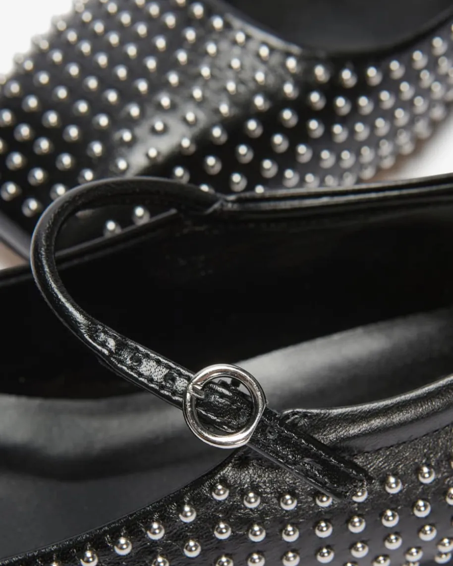 Uma Mini Studs Ballerinas für Damen von Aeyde in Schwarz und Silber. Elegant mitfemininem Biker-Twist – Das Modell aus hochwertigem Nappaleder avanciert dankeckiger Form mit schmalem Riemen sowie den abgerundeten Nieten-Applikationen zueinem stilsicheren Begleiter.