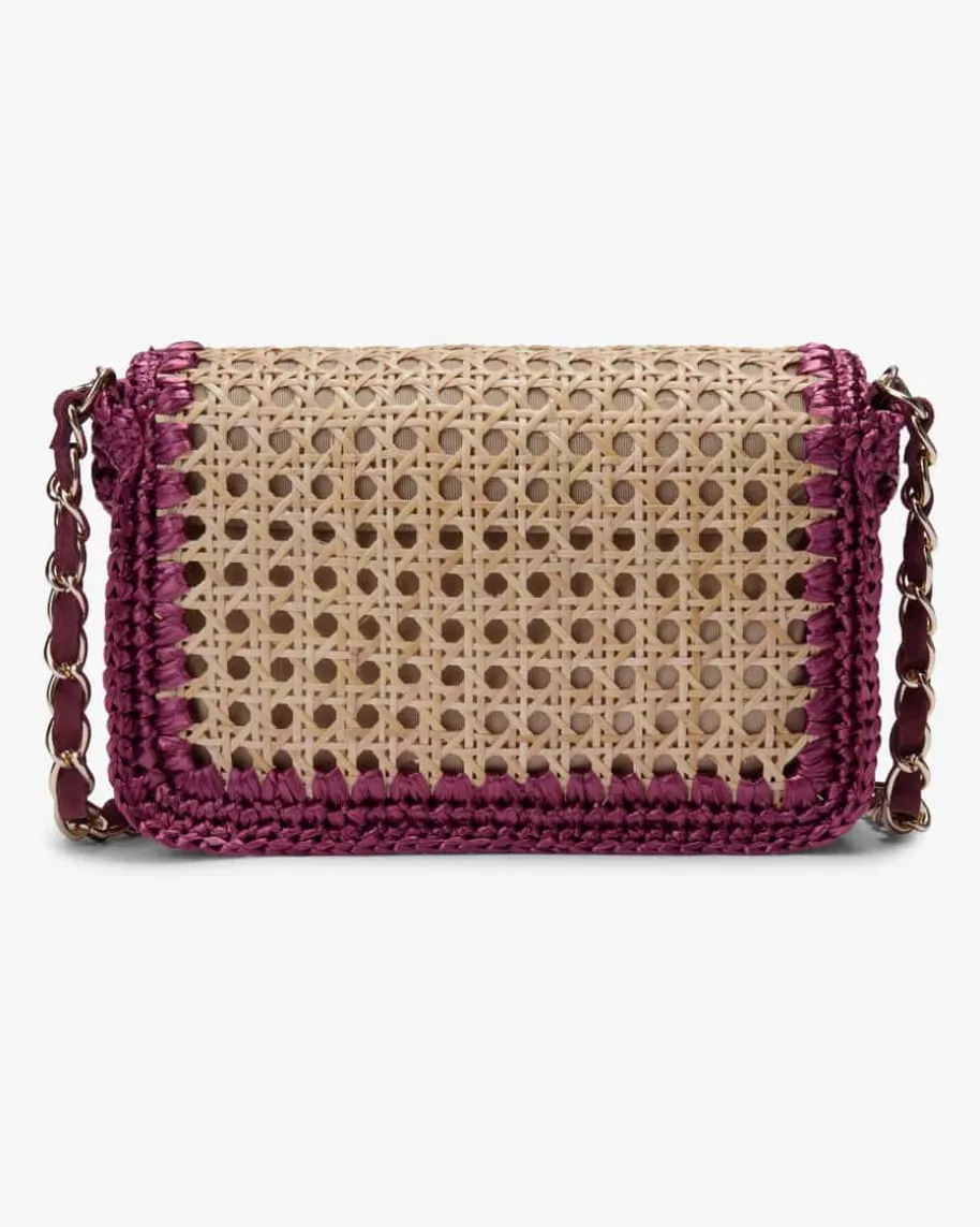 Umhängetasche von Caterina Bertini in Natur und Bordeaux. Made in Italy – Das1925gegründete Label hat bereits damals angefangen sich auf geflochtene Produkte zuspezialisieren und begeistert heutzutage mit hochwertiger Handwerkskunst, dankwelcher jedes Design zu einem Unikat wird. Diese Tasche begeistert incharakteristischer Wiener-Geflecht Aufmachung, während der Kettenträger denletzten Schliff verleiht.