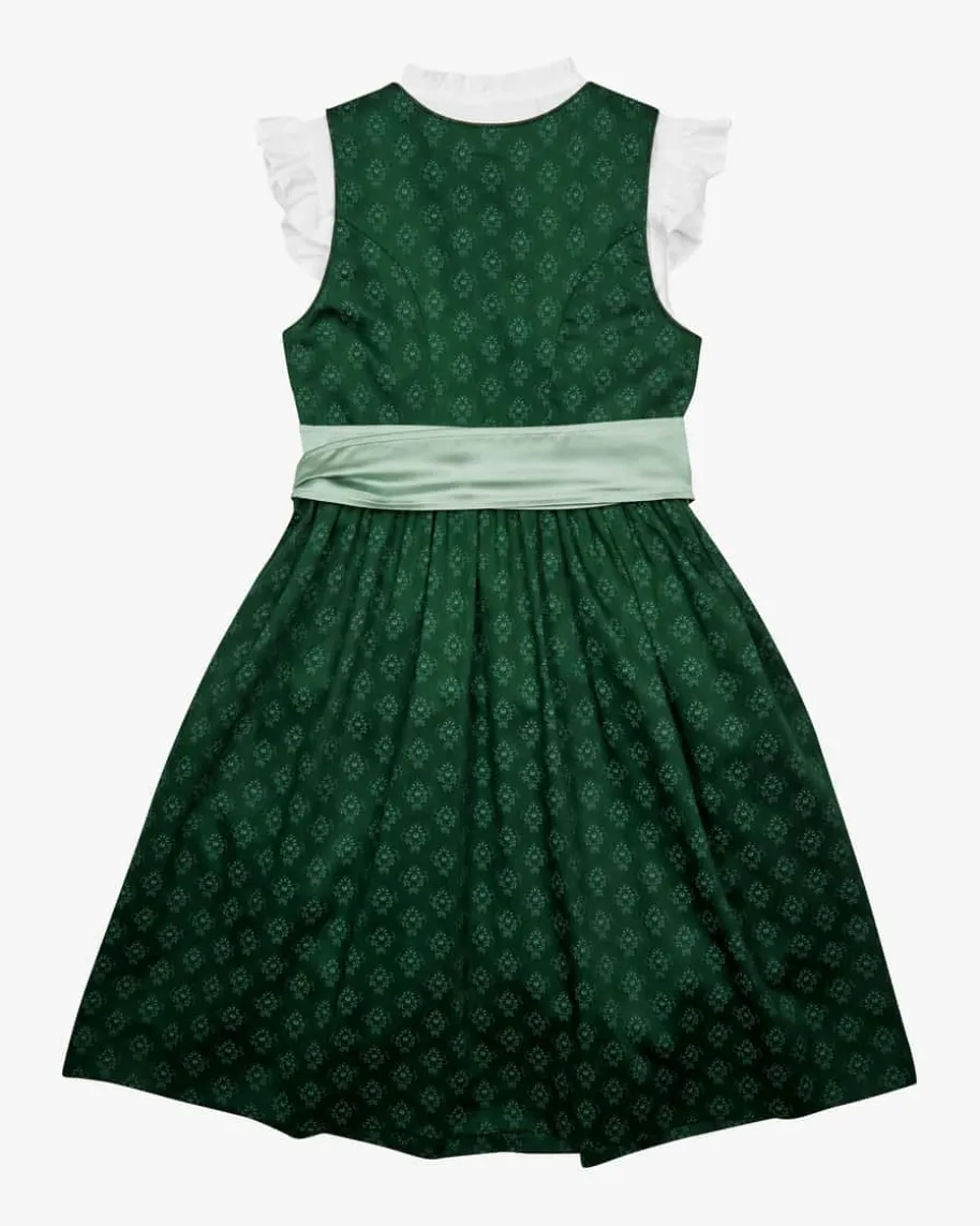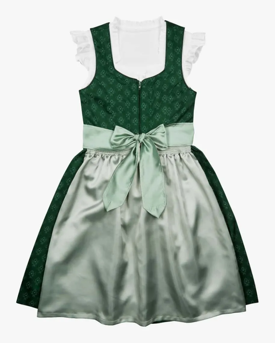 Viktoria Dirndl mit Bluse und Schürze für Mädchen von LODENFREY in Flaschengrünund Salbei. Dank der klassischen Schnittführung und dem Allover-Dessin ist dasModell traditionell gehalten, während die Zier-Biesen und die changierendeSchürze optische Highlights setzen.