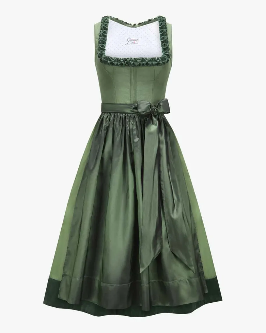 Vogue Midi-Dirndl mit Seidenschürze für Damen von Giacomelli Trachten in Grünund Dunkelgrün. Die Kreationen verbinden Tradition und Moderne und glänzen durchEleganz und Raffinesse. Auch dieses Modell präsentiert sich dank strukturiertemLeinen-Mieder sowie dem Baumwoll-Rock in femininer und zugleich traditionellerAufmachung. Samt-Details wie die raffinierte Froschgoscherl-Borten am Ausschnittkomplettieren das Trachten-Design gekonnt.