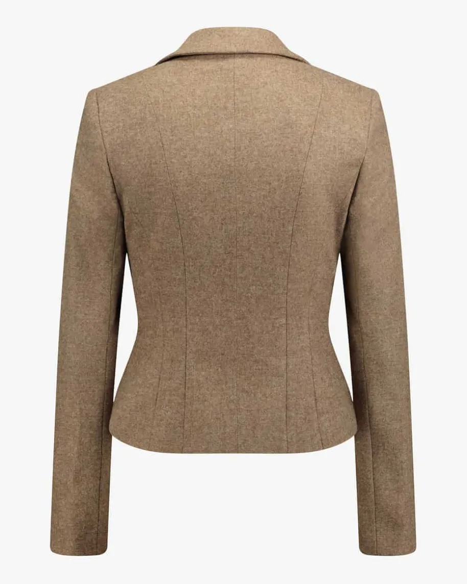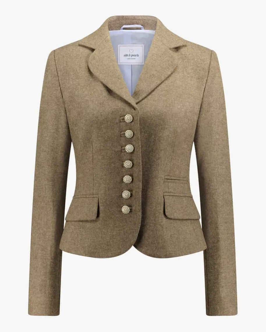 Vroni Trachtenblazer für Damen von Silk & Pearls in Taupe. Das feminin,taillierte Modell begeistert dank der hochwertigen Woll-Verarbeitung inmelierter Aufmachung, während diverse Abnäher ein traditionelles Kombi-Pieceschaffen. Zugleich runden raffinierte Knöpfe den Trachten-Look harmonisch ab.