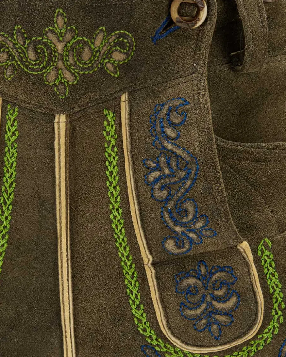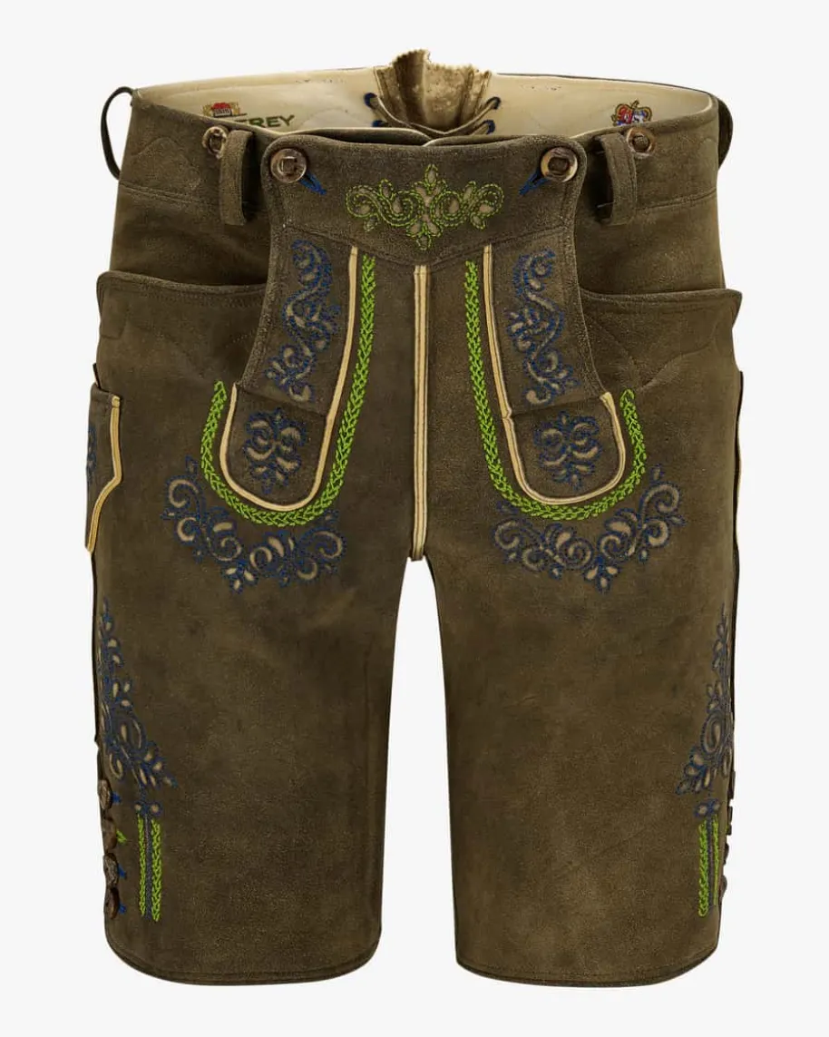 Weitenfels Lederhose kurz für Herren von Meindl in Nussbaum. Die besondereFarbgebung des sämisch, mit Naturfarbe handgegerbten Hirschleders wird vonReliefprägungen edel ergänzt. Rustikale Hornknöpfe vollenden den exklusiv beiLodenfrey erhältlichen Trachten-Look gekonnt.