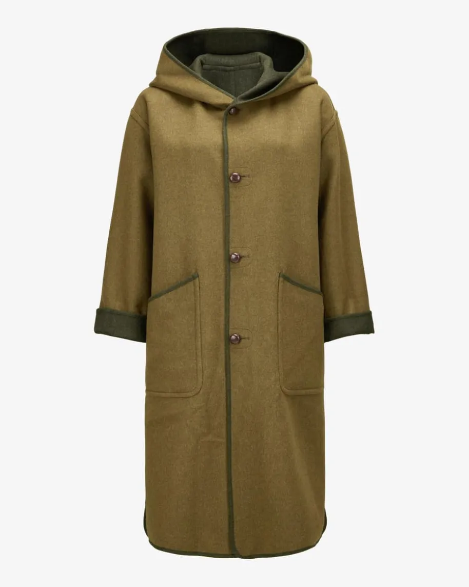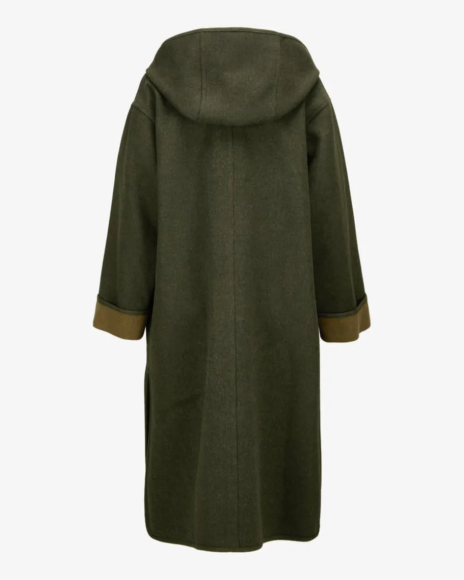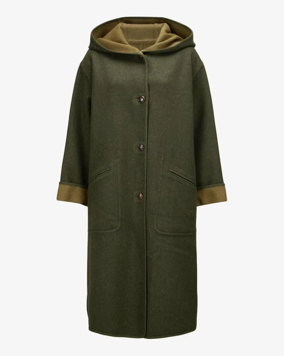Wende-Trachtenmantel für Damen von Münchner Lodenfabrik in Dunkelgrün. DasModellverleiht dank der Schurwoll-Qualität besonders hohen Tragekomfort, während daszeitlose Design sowie die Knopfleiste in Leder-Optik einen authentisch-traditionellen Look kreieren. Zugleich erweist sich der Mantel durch die Wende-Funktion als vielseitiger Trachten-Liebling.