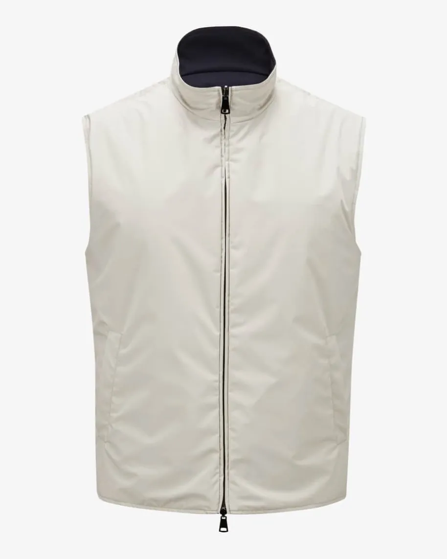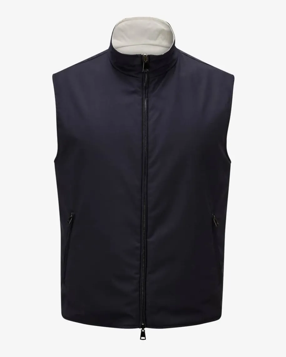 Wende-Weste für Herren von Manzoni 24 in Creme und Navy. Dieses Modell inhochwertiger Woll-Polyester-Qualität überzeugt mit angenehmer Haptik, währenddie schlichte Aufmachung und Wende-Funktion einen zeitlosen Begleiter schafft,der sich vielseitig kombinieren lässt und in keinem Kleiderschrank fehlensollte.