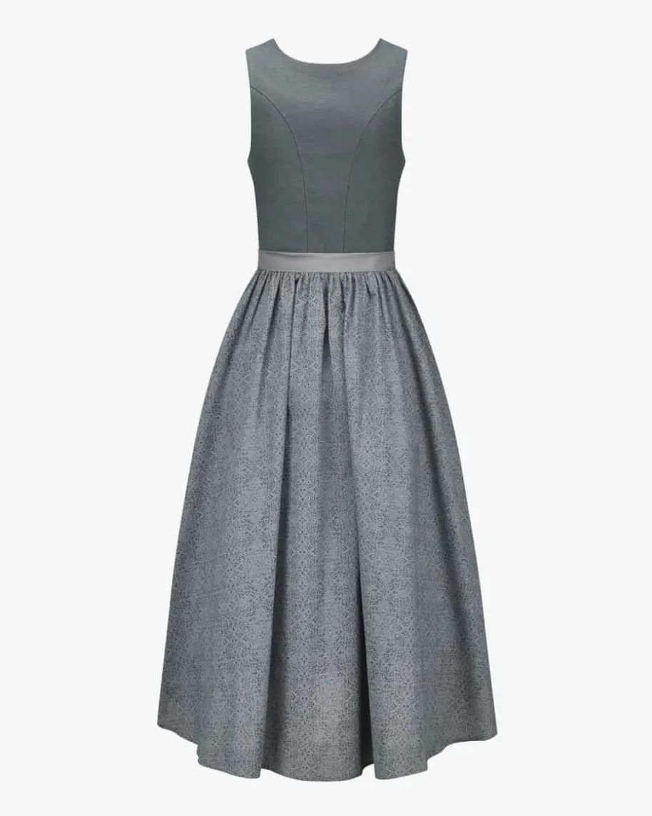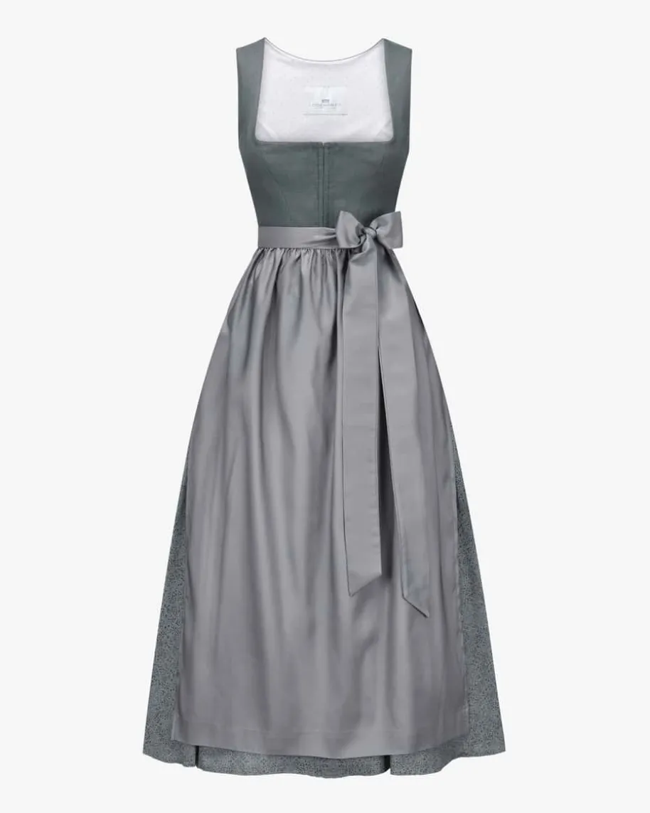 Wiesndirndl lang mit Schürze für Damen von LODENFREY München 1842 in Grau undHellgrau. Dank der Verwendung von hochwertiger Leinen-Qualität im Mieder undeinem feinen Ornament-Muster im Baumwoll-Rock wird ein traditioneller Favoritmit minimalistischem Charme kreiert. Die changierende Schürze mit Seide rundetdas Trachten-Gesamtbild harmonisch ab.