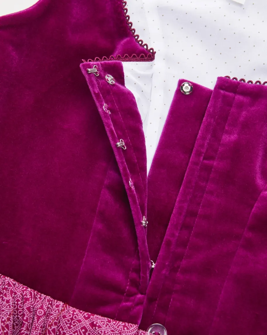 Wiesndirndl lang mit Schürze für Damen von LODENFREY München 1842 in Beere undAltrosa. Dank der Verwendung von hochwertiger Baumwollsamt-Qualität im Miederund einem feinen Ornament-Muster im Rock wird ein traditioneller Favorit mitminimalistischem Charme kreiert. Die changierende Schürze mit Seide rundet dasTrachten-Gesamtbild harmonisch ab.