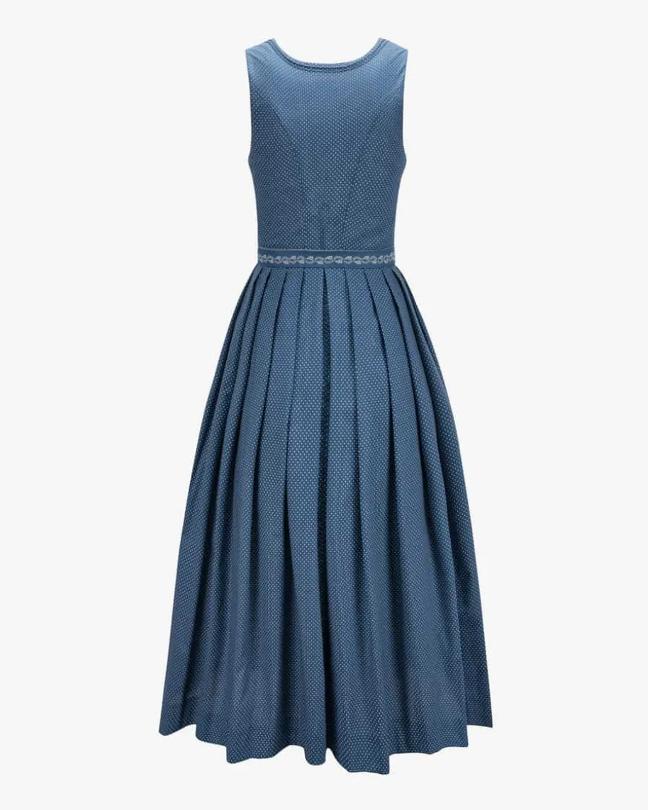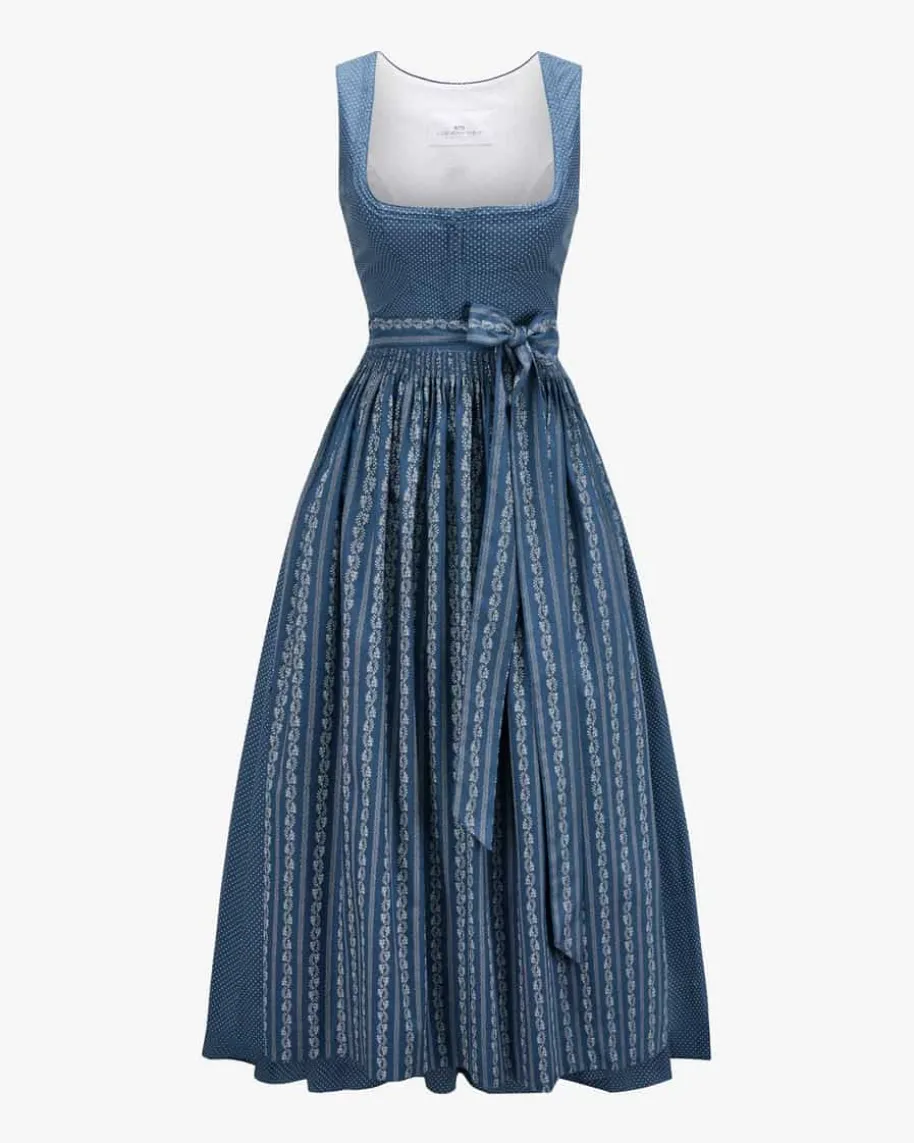 Wiesndirndl lang mit Schürze für Damen von LODENFREY in Dunkelblau und Weiß.Dank der Verwendung von leichter Baumwoll-Qualität und der Kombination vonfeinem Punkte-Muster und floralem Print wird ein traditioneller Favorit mitfemininem Charme kreiert. Klassische Trachten-Details runden das stilvolleGesamtbild harmonisch ab.