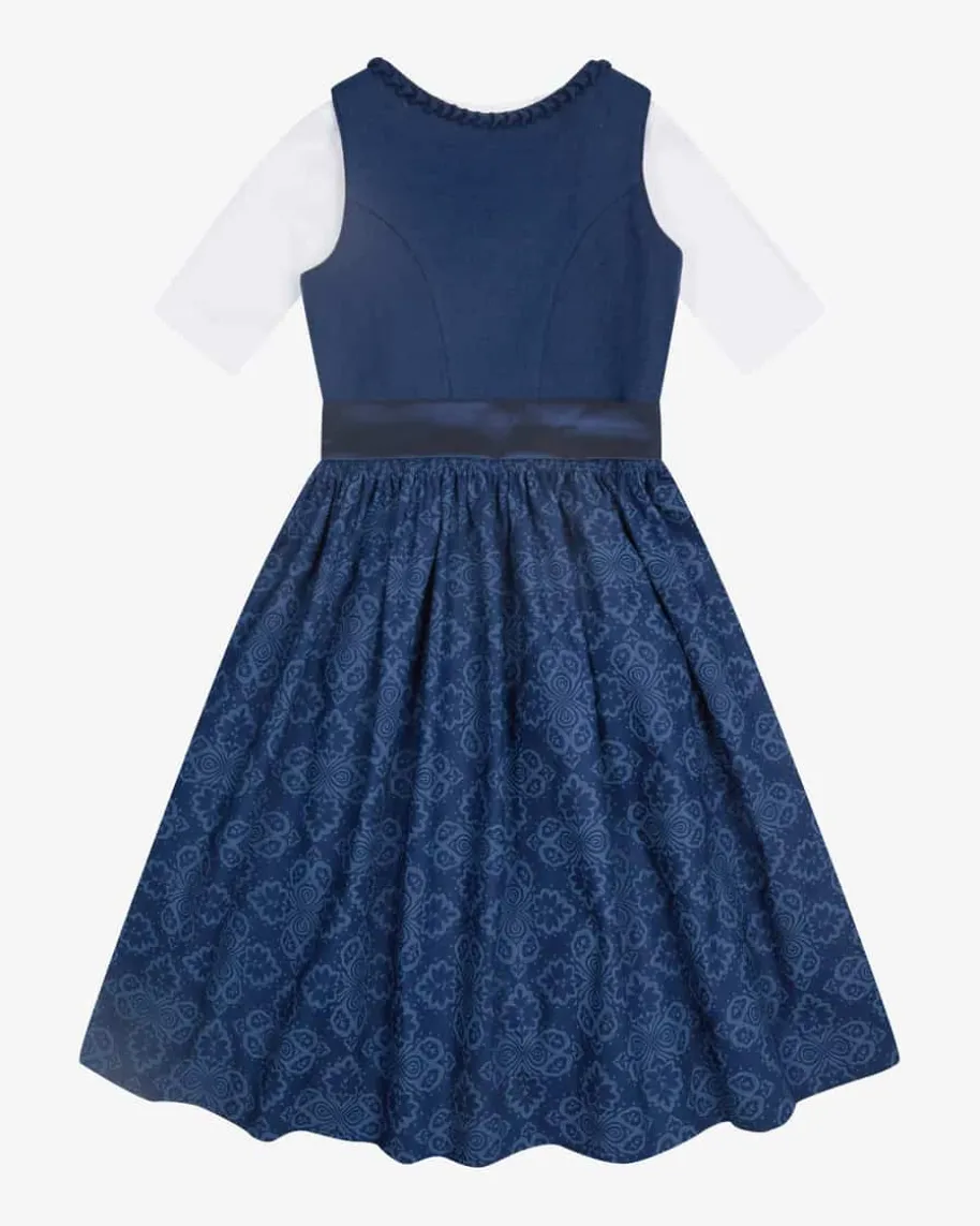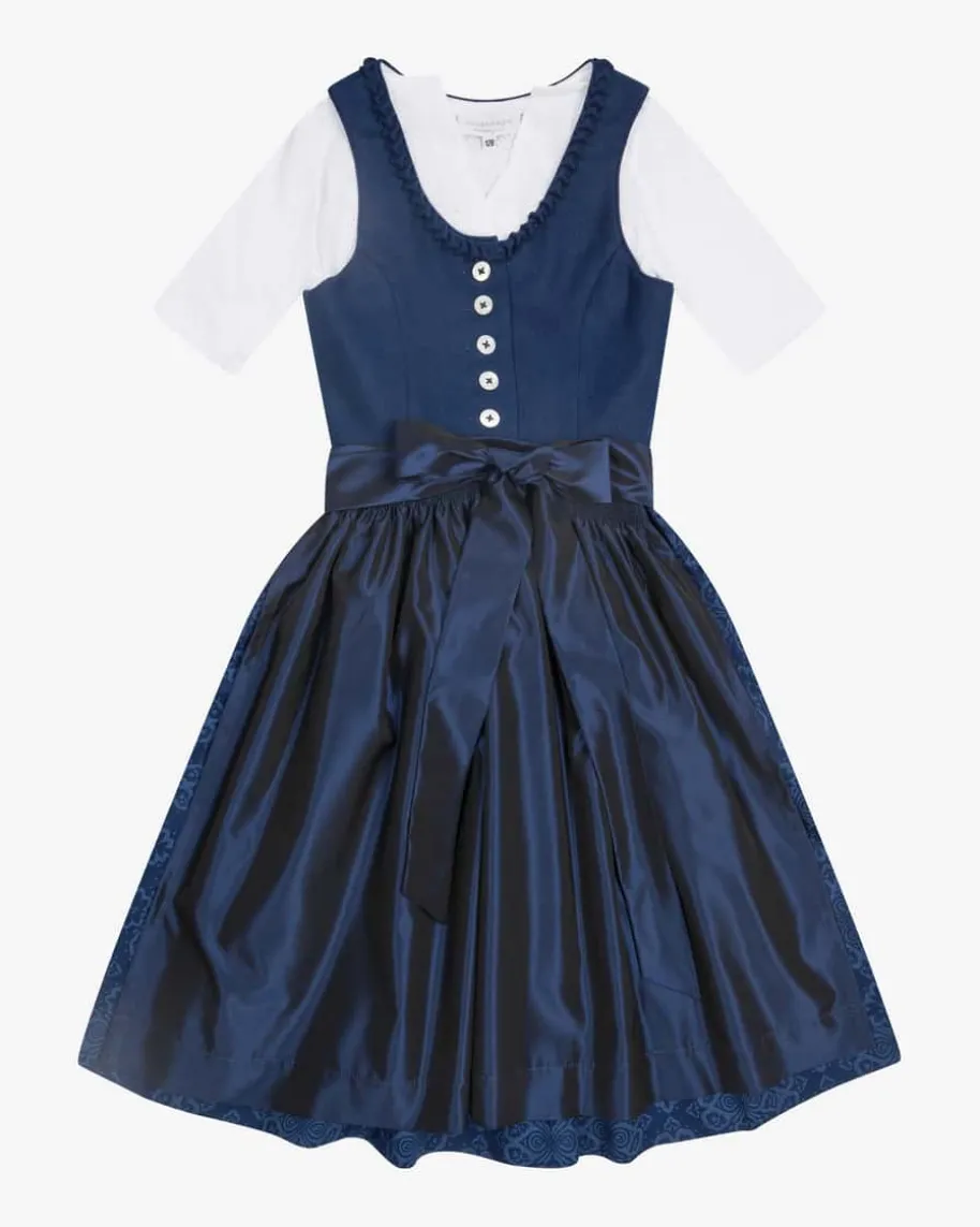 Wiesndirndl mit Bluse und Schürze für Mädchen von LODENFREY in Dunkelblau. Dankder klassischen Schnittführung und dem Leinen-Mieder begeistert das Modell mitmodernem Charme. Zugleich sorgen der Rock mit floralen Ornamenten und diechangierende Schürze für optische Highlights.
