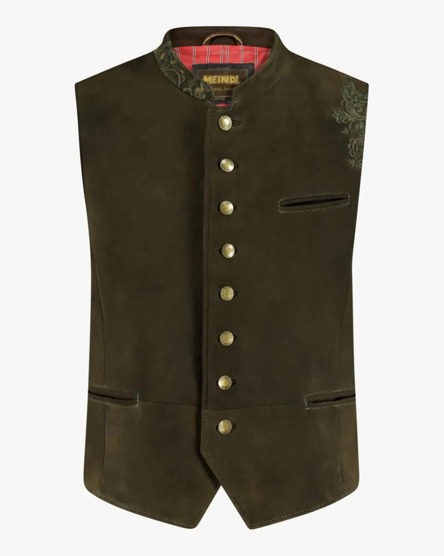Wolfgang Trachten-Lederweste für Herren von Meindl in Ahorn. Das rustikaleModell aus hochwertigem Hirschleder überzeugt mit klassischen Details und feinenZiernähten als perfekter Partner für besondere Trachten-Looks. FiligraneStickereien an Kragen und Ärmellöchern sorgen für eine traditionelle Note.