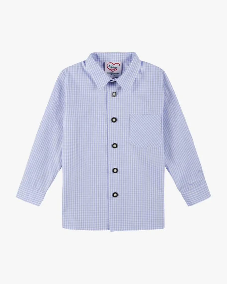 Wolfgang Baby-Trachtenhemd von Pacher in Hellblau und Weiß. Das geradegeschnittene Modell präsentiert sich dank klassischem Karo-Dessin intraditioneller Aufmachung, während die Knöpfe in Horn-Optik sowie dieBrusttasche das Gesamtbild gekonnt ergänzen.