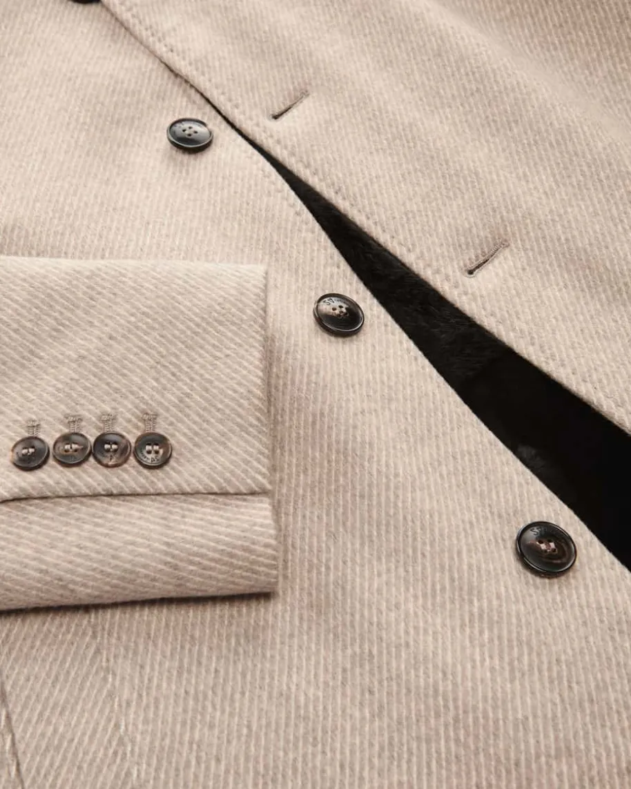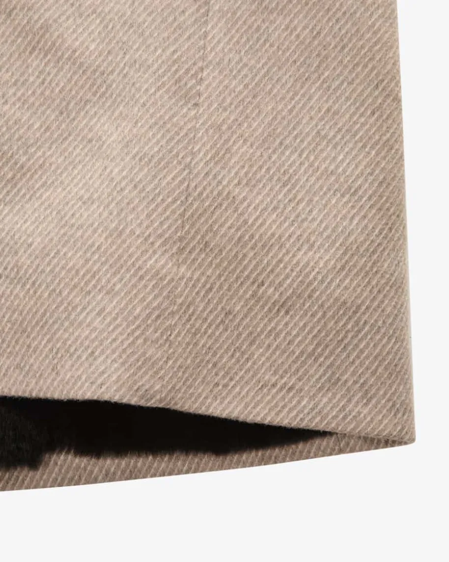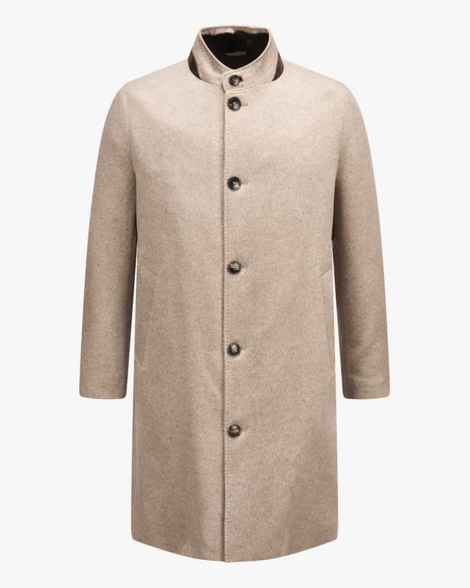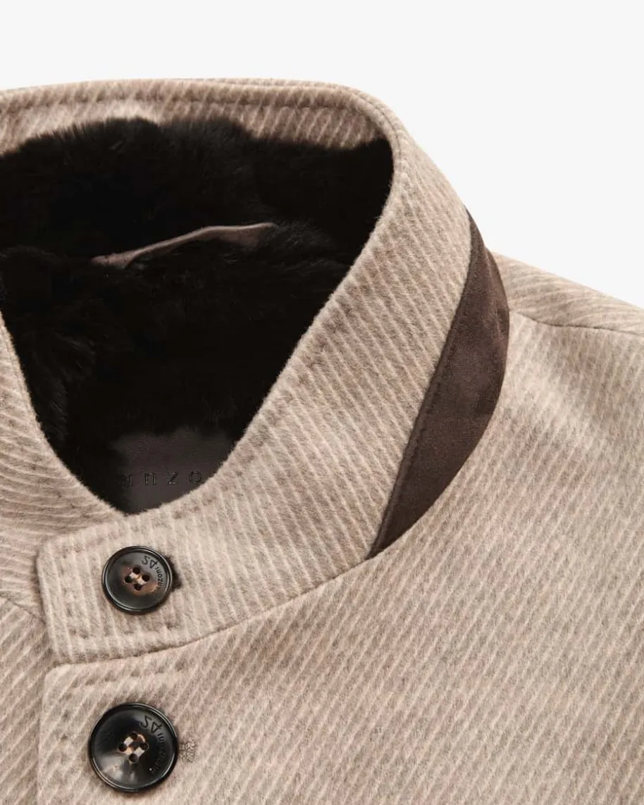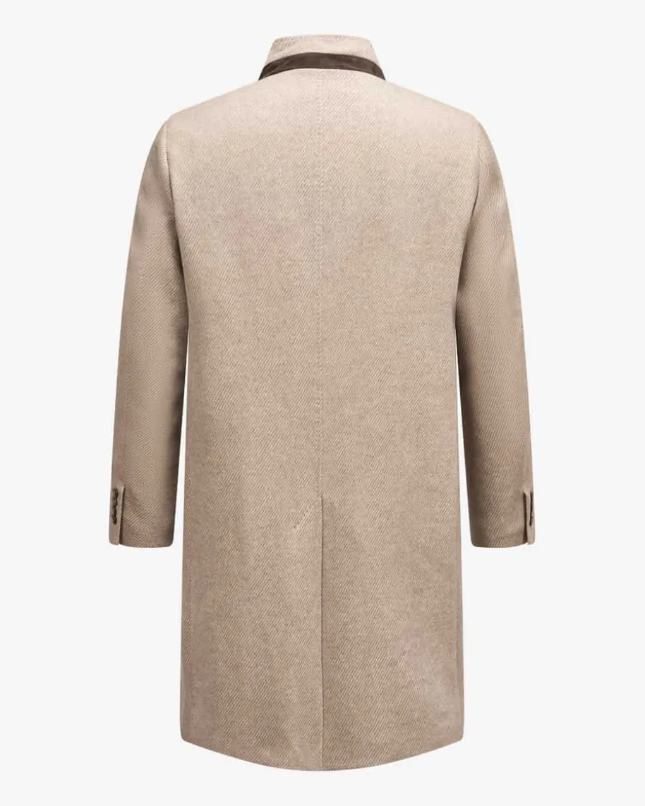 Wollmantel für Herren von Manzoni 24 in Taupe und Braun. Die Verwendung vonhochwertigem Schurwoll-Cashmere-Mix und kuscheligem Kaninchenfell-Futterverleiht dem Modell angenehme Tragemomente, während die klassische Aufmachungeinen stilvollen Touch verleiht. Zugleich rundet die Leder-Partie am Kragen denmaskulinen Look gekonnt ab.