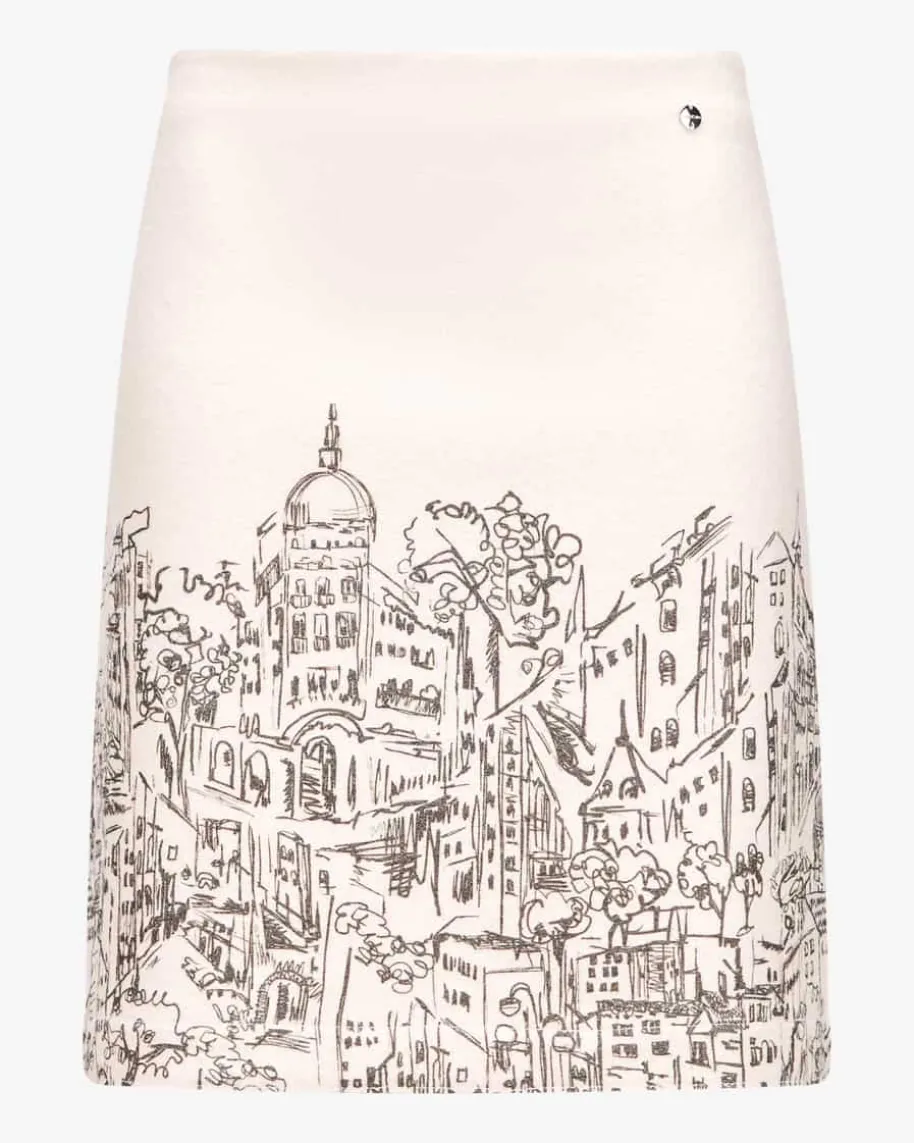 Wollrock für Damen von Marc Cain in Ecru. Marc Cain ist eine deutsche Premium-Modemarke, die seit über 50 Jahren moderne, selbstbewusste Frauen mithochwertigen Materialien und außergewöhnlichen Prints begeistert. Auch diesesModell überzeugt mit optischen wie haptischen Highlights dank der hochwertigenSchurwoll-Qualität und dem originellen Skyline-Print im Zeichenstil.