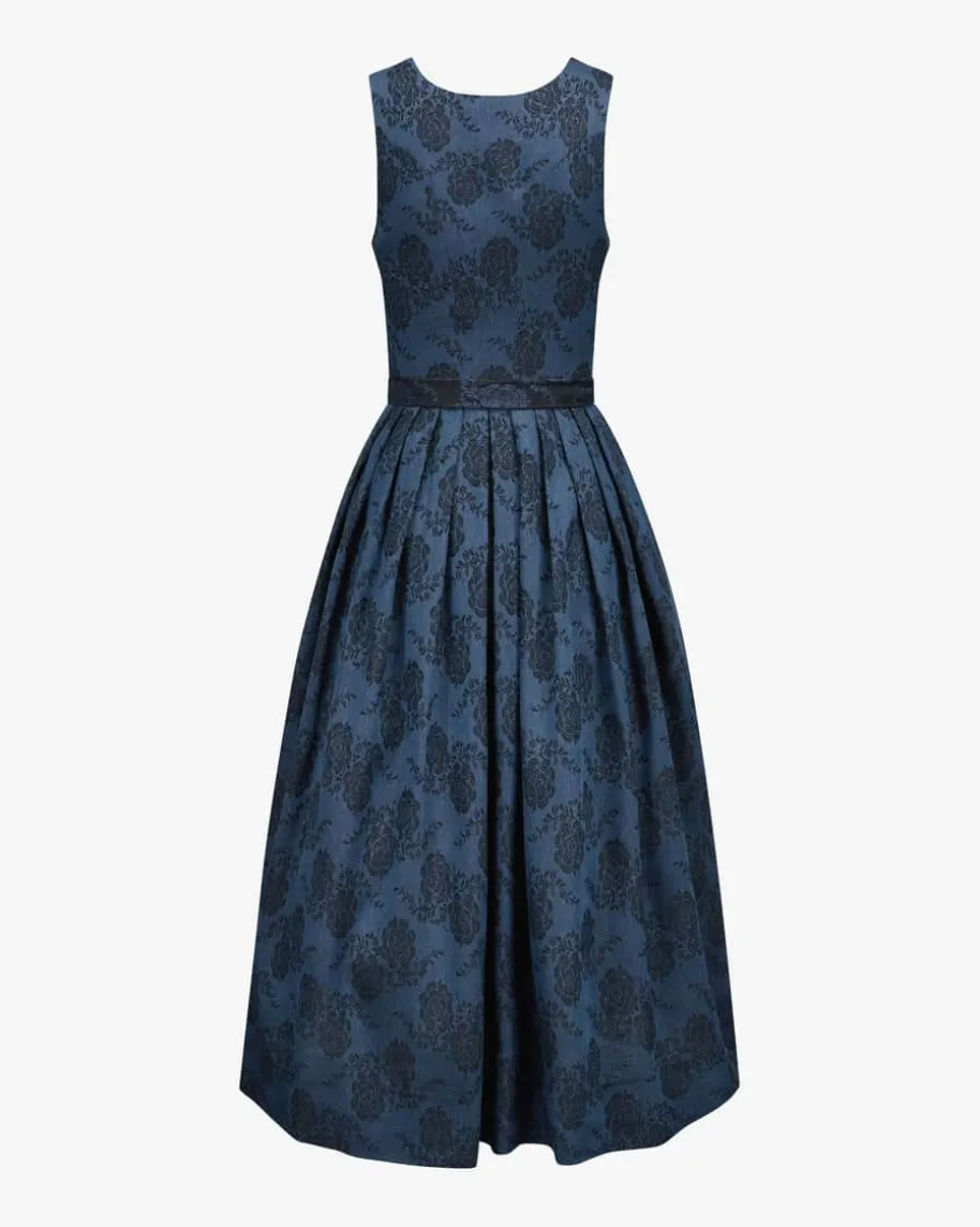 Antonia Dirndl lang mit Schürze für Damen von Gottseidank in Dunkelblau undSchwarz. Tracht mit modernem Zeitgeist – Dank des floralen Jacquard-Musters inhochwertiger Leinen-Schurwoll-Qualität begeistert das Modell mit traditionellerAufmachung. Zugleich rundet die gestiftelte Schürze mit labeltypischen,austauschbaren Schürzenbändern den Look gekonnt ab.