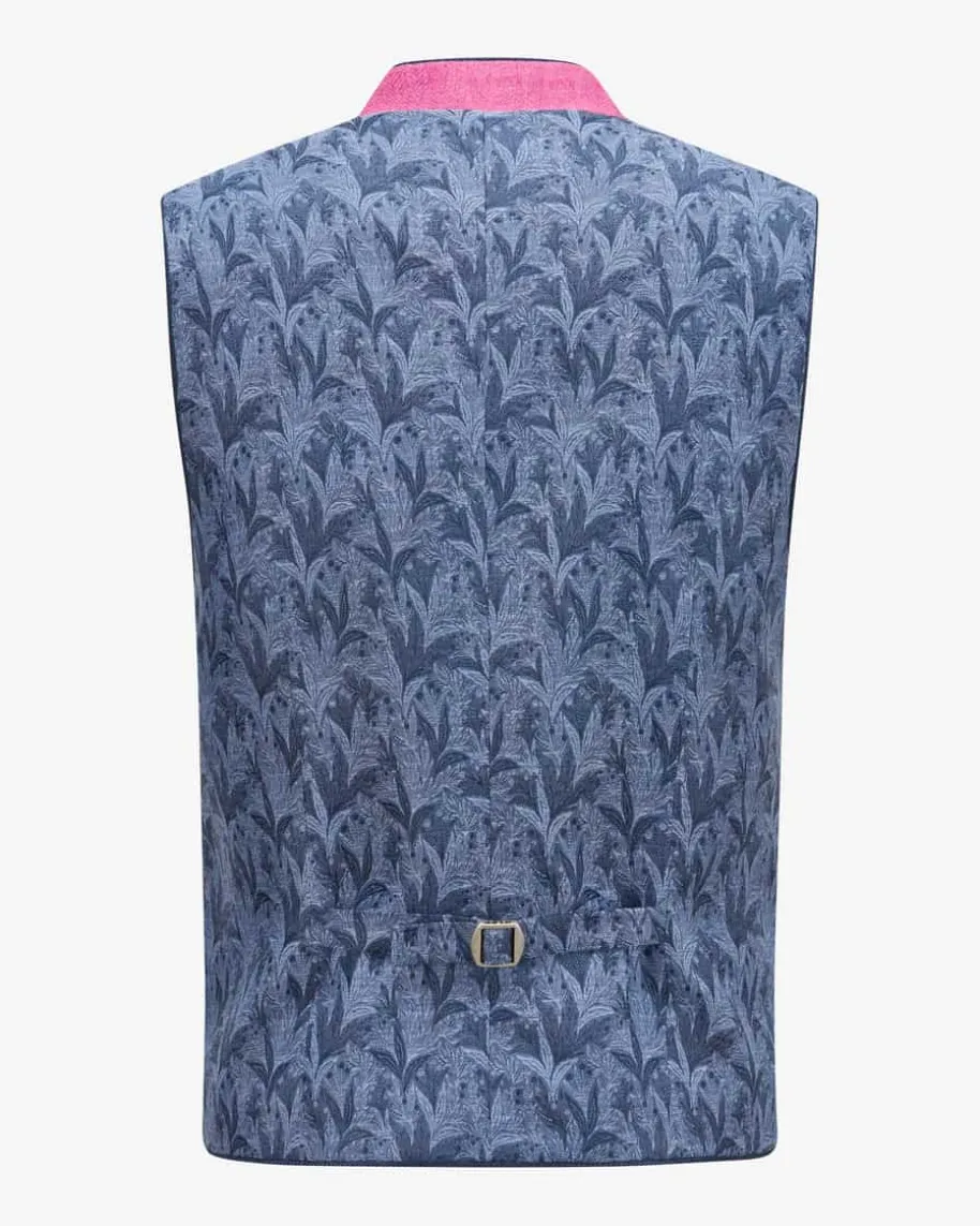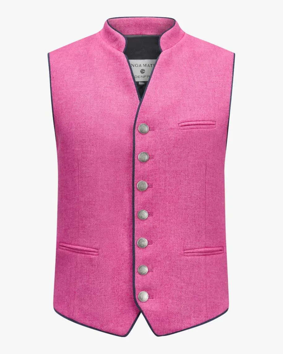 Henry Trachtenweste für Herren von Kinga Mathe in Pink und Dunkelblau. Dasexklusive Modell besticht mit traditionellen Details, welche dank silberfarbenerMünzknöpfe mit Wappen-Prägung sowie dem Material-Mix-Design mit weicherFischgrät-Struktur und edlem Blättermuster auf der Rückseite gekonnt in Szenegesetzt wird. Zugleich ergänzen feine Kordel-Paspelierungen den Trachten-Lookharmonisch.