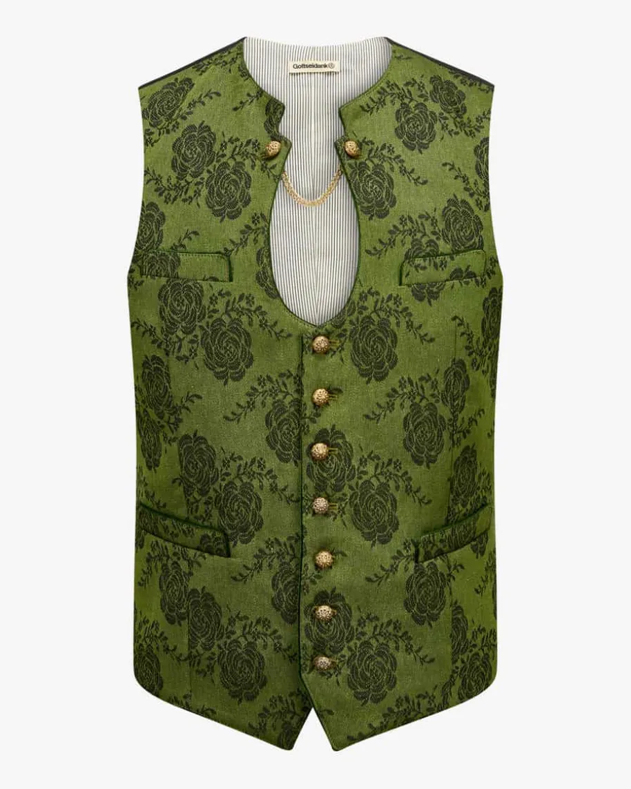 Ignaz Trachtenweste für Herren von Gottseidank in Moosgrünund Schwarz. Das exklusiv erhältliche Modell begeistert mitangenehmer Leinen-Schurwoll-Qualität intraditioneller Optik, welche durch filigran gemusterteKugelknöpfe sowie derMiesbacher-Aufmachung mit Ketten-Applikation harmonischuntermalt wird. Daszarte Blumenmuster rundet den Look zusammen mit demJacquard-Rückenteil modischab.