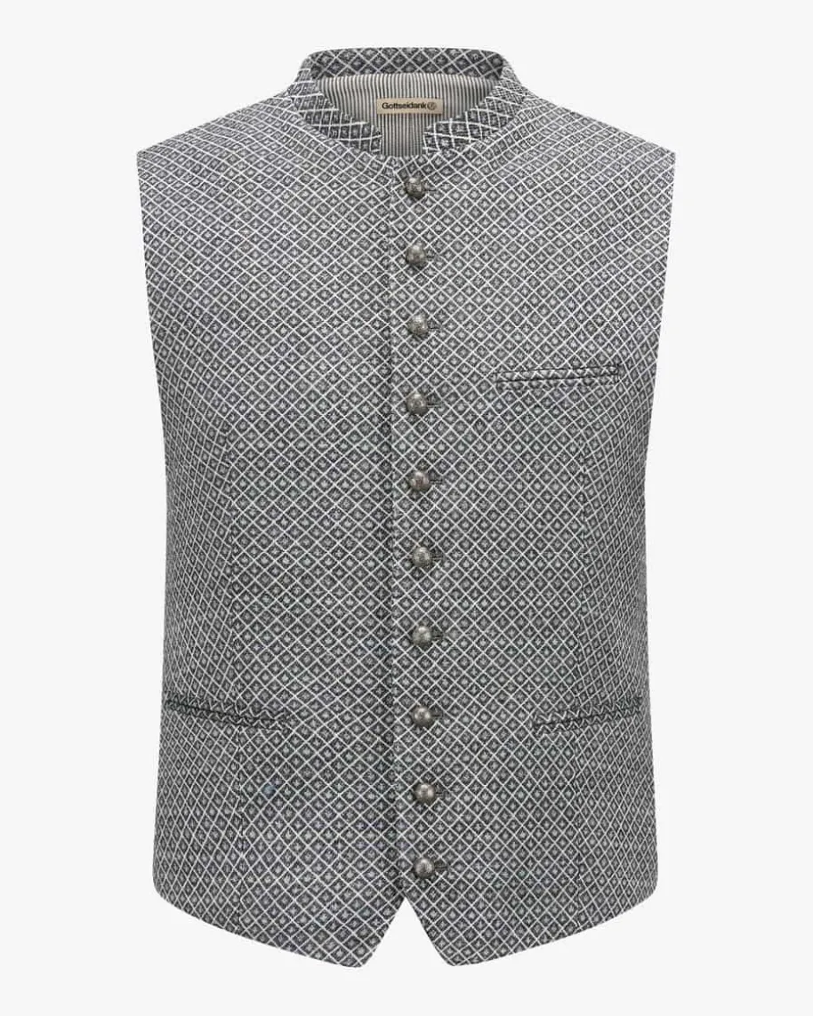 Konstantin Trachtenweste für Herren von Gottseidank in Grau, Schwarz und Blau.Das taillierte Modell überzeugt mit dem einzigartigen, exklusiv bei LODENFREYerhältlichen Karo-Muster, welches ihrem Trachten-Look eine besondere Noteverleiht. Zugleich runden raffinierte Knöpfe sowie klassische Details dastraditionelle Gesamtbild stilvoll ab.