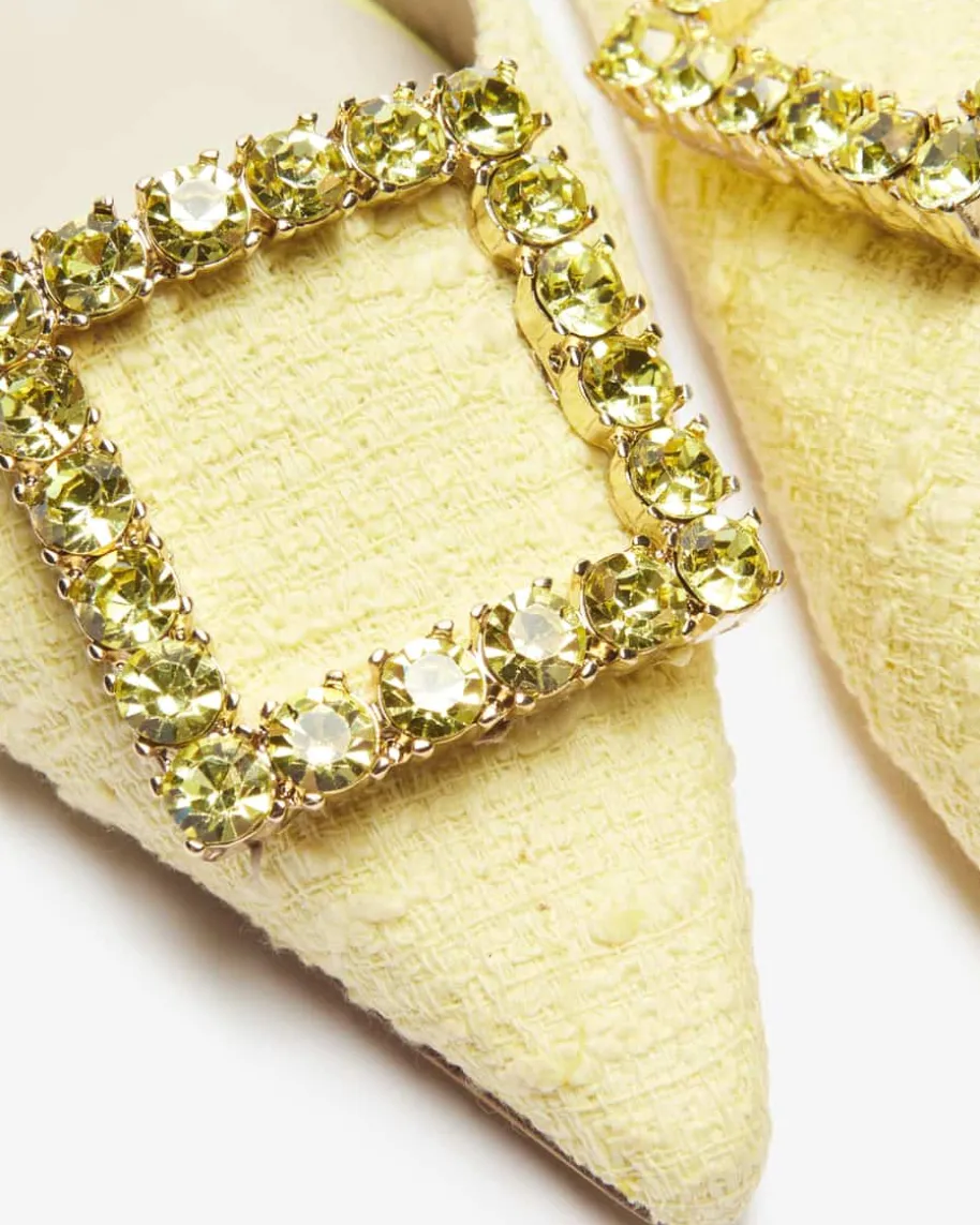 Lavanda Slingback-Ballerinas für Damen von Festa in Gelb. Dieses Modellbegeistert dank der stilvollen Kombination aus Tweed-Aufmachung undverstellbarem Slingback-Riemen, während die markante viereckige Brosche mitSchmuckstein-Besatz den Schuh zu einem absoluten Blickfang für feminine Looksavancieren lässt.