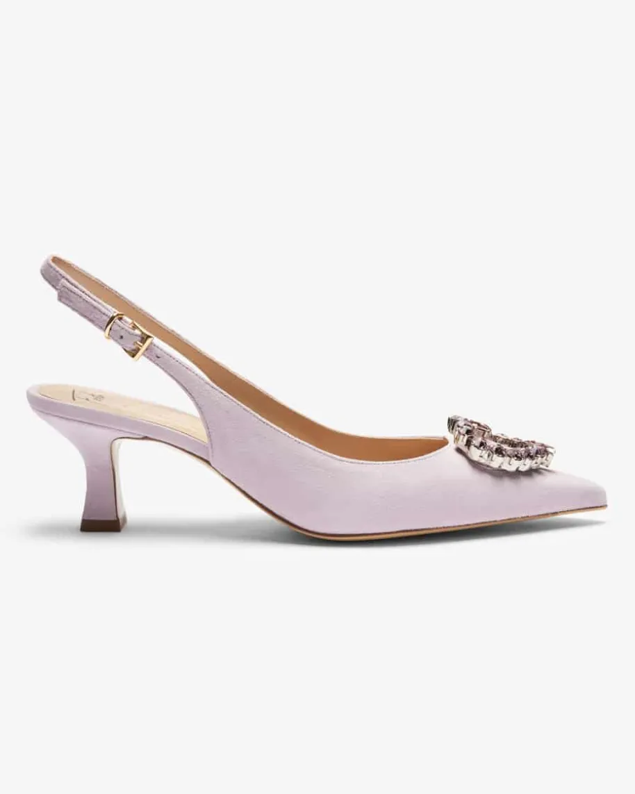Lester Slingback-Pumps für Damen von Festa in Flieder. Dieses Modell bestichtdank der eleganten Veloursleder-Aufmachung und dem verstellbaren Slingback-Riemen, während die markante herzförmige Brosche mit Schmuckstein-Besatz denSchuh zu einem absoluten Blickfang für Ihre Trachten-Looks macht.