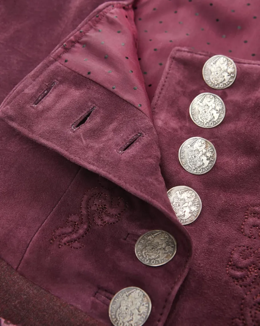 Linderhof Dirndl lang mit Schürze für Damen von Meindl in Dark Cherry. DasModell spiegelt die hochwertige Lederhandwerkskunst von Meindl gekonnt wider.Das Mieder besticht durch die Verwendung von weichem Veloursleder und wird durchfeine Zierstickereien stilvoll ergänzt. Zugleich setzt der Rock aus meliertemWoll-Mix das traditionelle Design gekonnt in Szene, während die Schürze mitfeinem Paisley-Dessin das Gesamtbild harmonisch komplettiert.