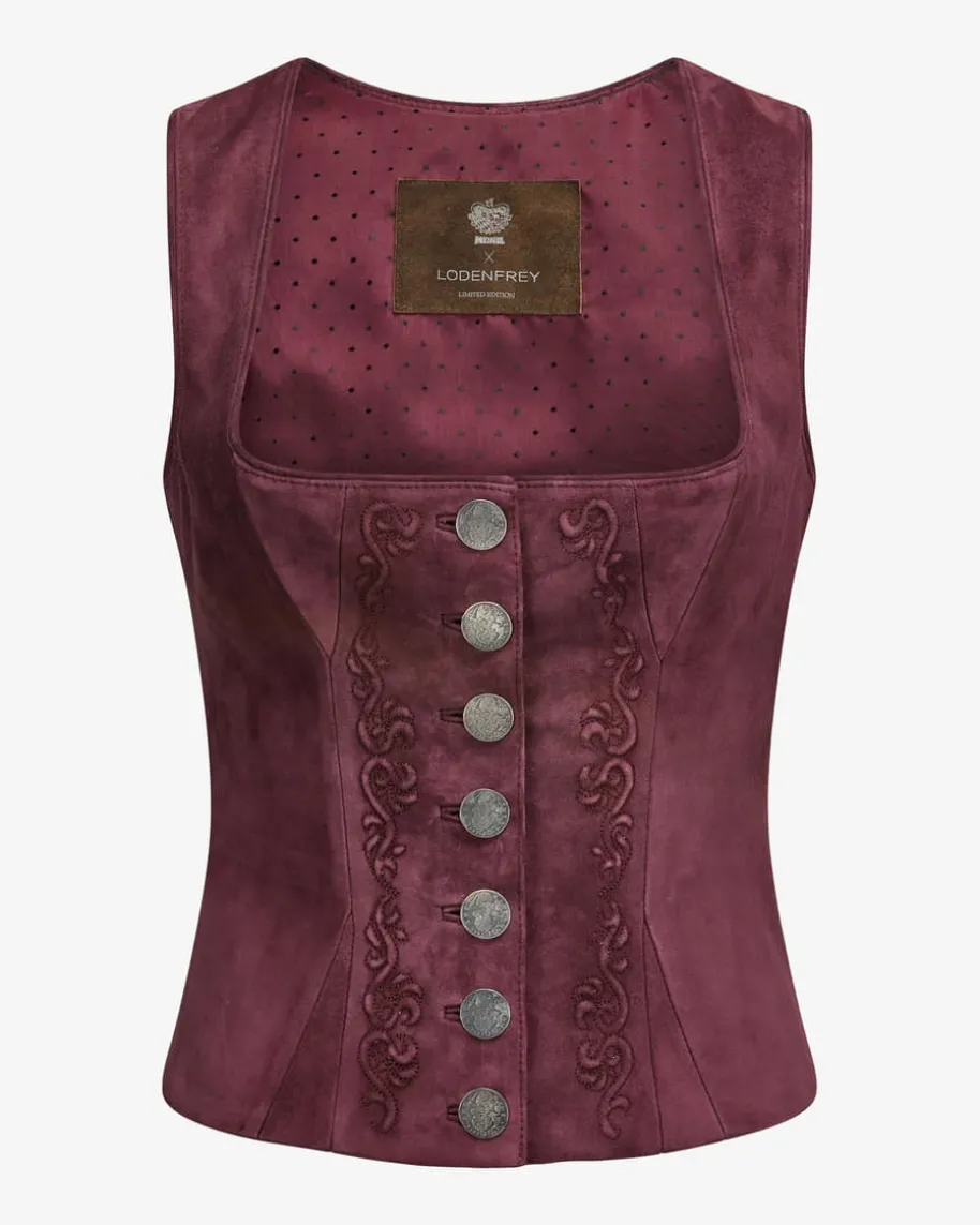 Linderhof Trachten-Ledermieder für Damen von Meindl in Dark Cherry. DasTraditionsunternehmen Meindl steht seit Jahrzehnten für traditionelle Handarbeitund höchste Qualität. Auch dieses exklusiv für LODENFREY entworfene Modell aushochwertigem Ziegenleder überzeugt mit taillierter Passform und weicherOberflächen-Verarbeitung. Handgemachte Silberknöpfe und feine Zierstickereienrunden den Trachten-Look gekonnt ab.