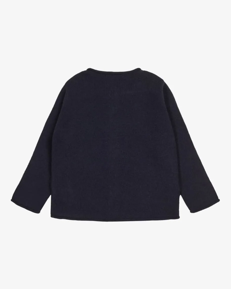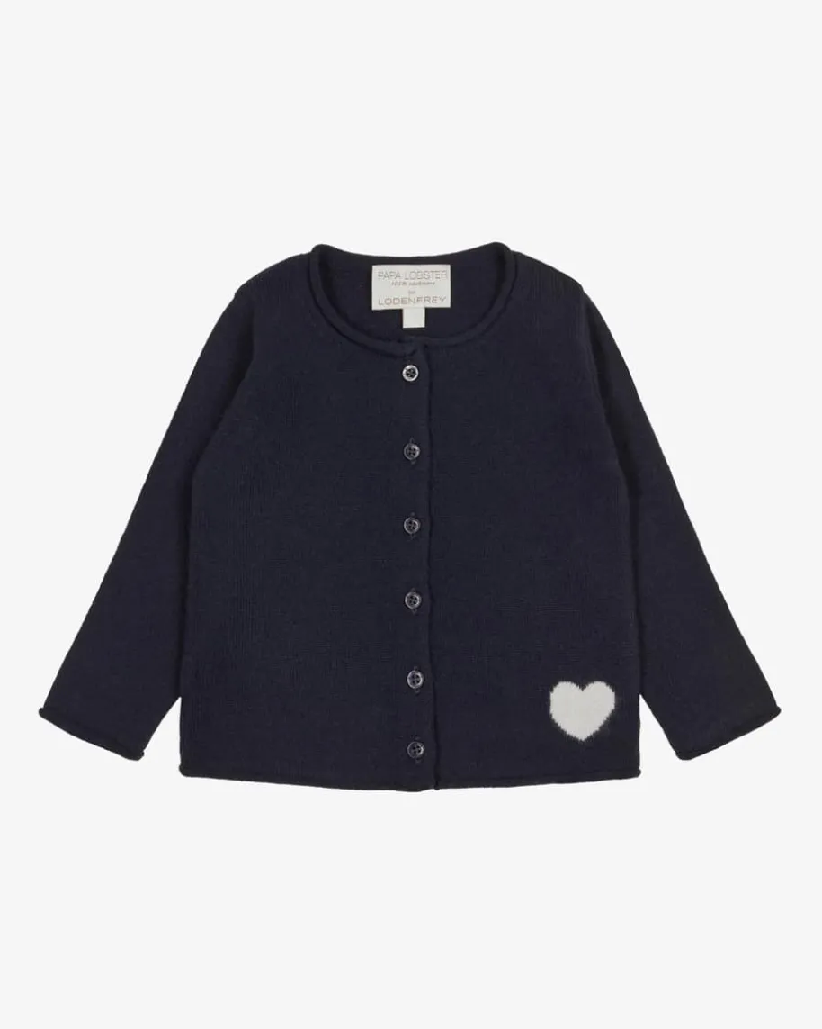 Luise Cashmere-Strickjacke für Babys von Papa Lobster in Navy. Das Modellbesticht dank der hochwertigen Cashmere-Qualität mit besonders angenehmenTragemomenten, während die Herz-Intarsie dem Look einen niedlichen Charakterverleiht.