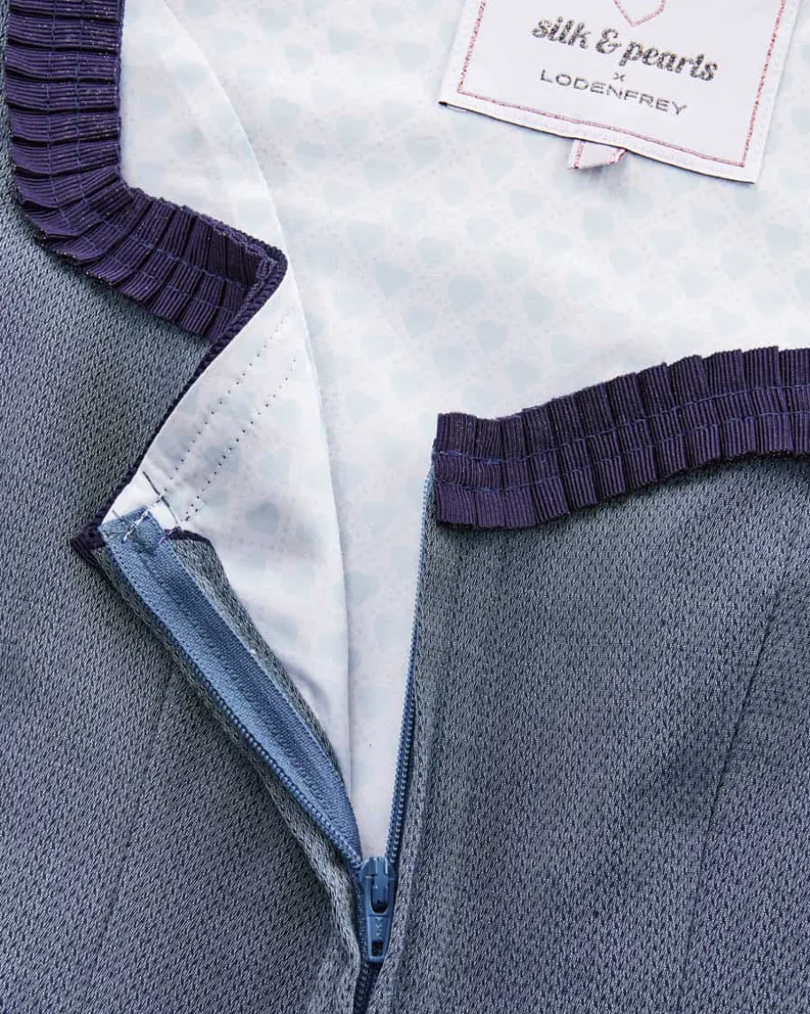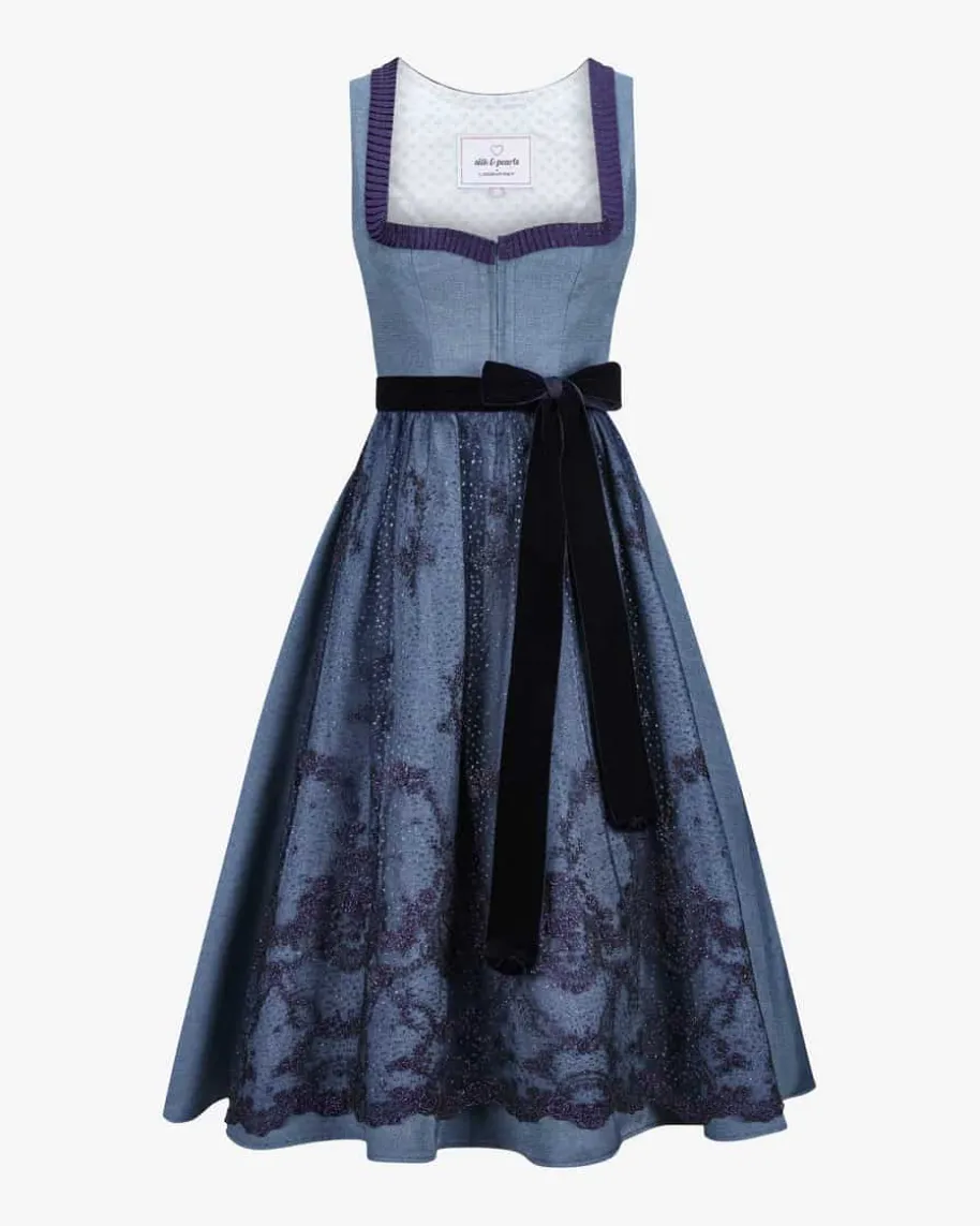 Midi-Dirndl mit Schürze für Damen von Silk & Pearls in Hellblau und Marine. Dasexklusiv bei Lodenfrey erhältliche Modell überzeugt im angesagten Ton-in-Ton-Design. Während die dezente Allover-Struktur für einen eleganten Look sorgt,setzt die leicht glitzernde Zierborte modische Akzente. Zugleich rundet diesemitransparente Tüll-Schürze mit floralen Stickereien, Glitzer-Details undSamtband den Trachten-Look stilvoll ab.
