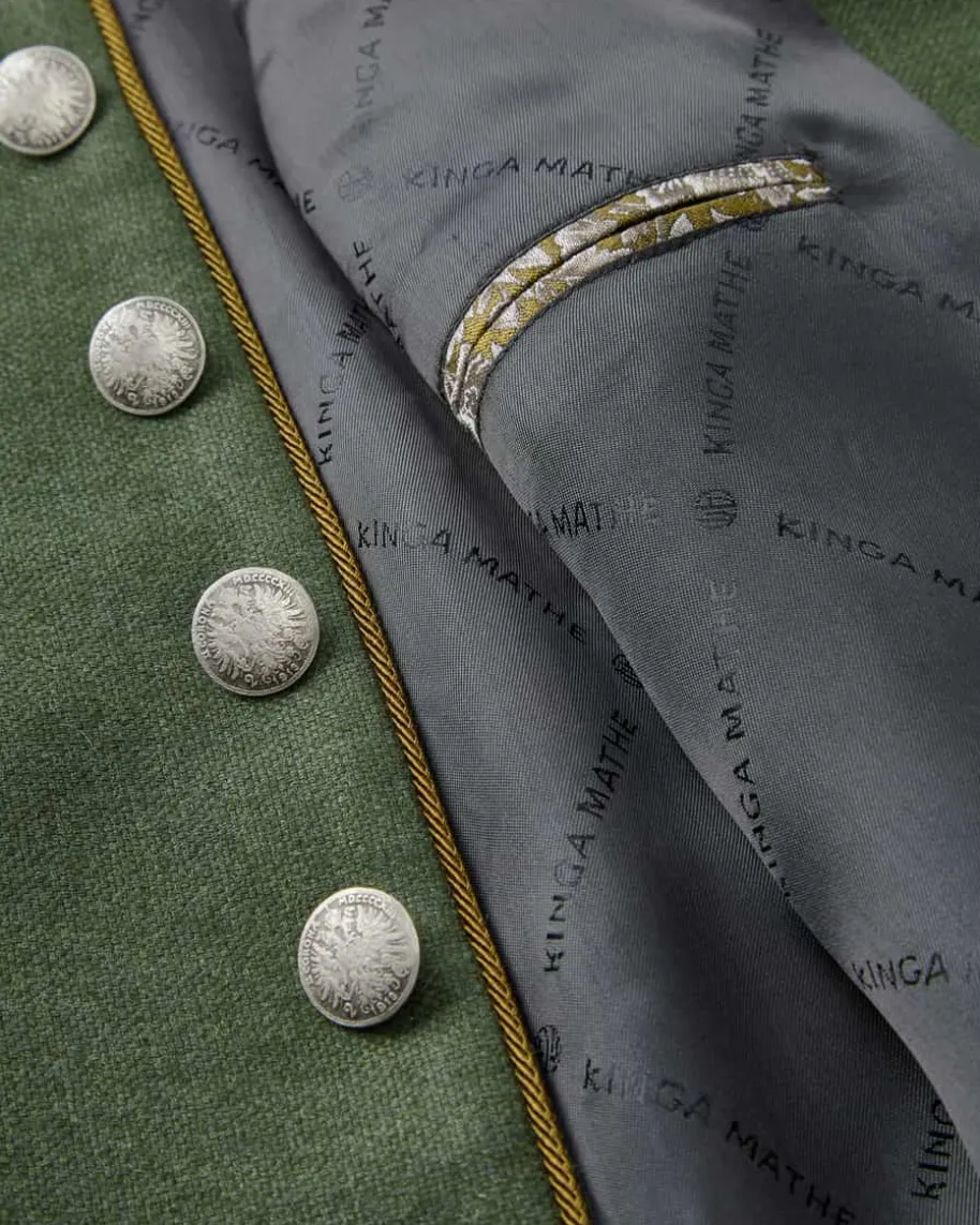 Nick Trachtenweste für Herren von Kinga Mathe in Grün. Das Modell präsentiertsich dank der gemusterten Rückenpartie mit floralem Motiv als modischer Favorit,während klassische Details ein traditionelles Gesamtbild für festliche Anlässeschaffen.