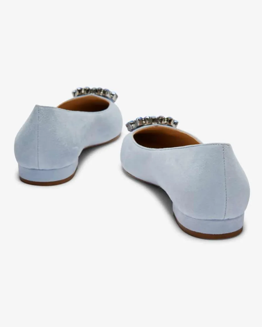 Santana Ballerinas für Damen von Festa in Hellblau. Das feminine Modell bestichtdurch die Verwendung von hochwertigem Veloursleder, das zusammen mit der spitzenForm und dem dezenten Absatz den Schuh zu einem festlichen Begleiter avancierenlässt. Gleichzeitig rundet die markante herzförmige Brosche mit Schmuckstein-Applikationen das Design elegant ab.