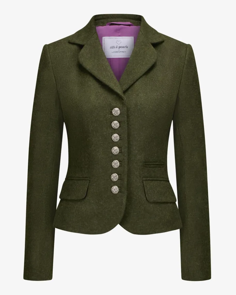 Trachtenblazer für Damen von Silk & Pearls in Oliv. Das feminin, taillierteModell begeistert dank der hochwertigen Woll-Verarbeitung in melierterAufmachung, während diverse Abnäher ein traditionelles Kombi-Piece schaffen.Zugleich runden raffinierte Knöpfe den Trachten-Look harmonisch ab.