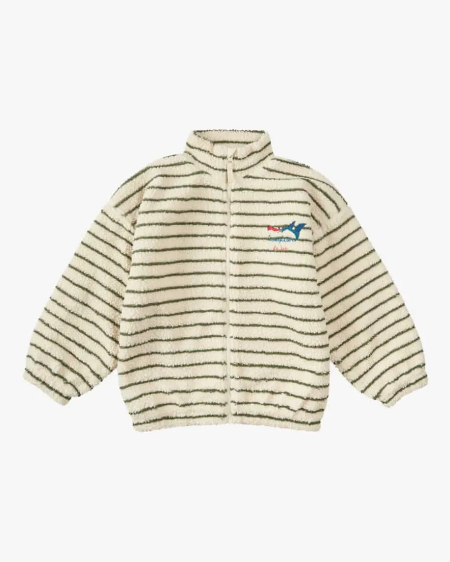 Jacke für Jungen von Konges Slojd in Creme und Flaschengrün. Das Modell aus derRosie Huntington-Whiteley-Kollektion präsentiert sich mit klassischem Streifen-Dessin, das durch die kuschelige Plüsch-Qualität modisch in Szene gesetzt wird.Die Drachen-Stickereien auf Vorder- und Rückseite vollenden den Lookeinzigartig.