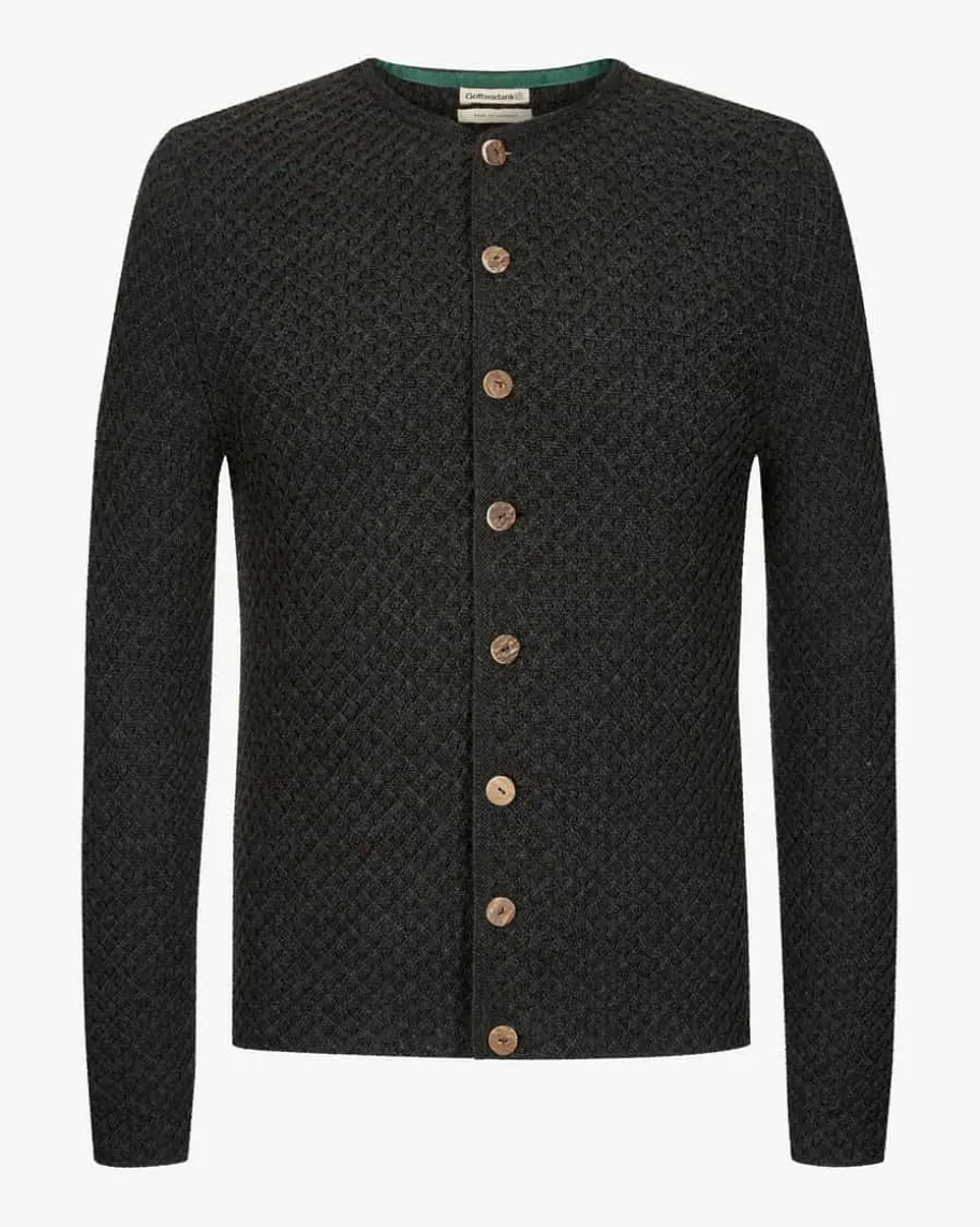 Xaver Trachten-Strickjacke für Herren von Gottseidank in Schwarz. Tracht mitCharakter – Traditionelle Details sowie hochwertige Verarbeitung schaffen einmodernes Highlight für besondere Herren-Outfits. Zugleich untermalen rustikaleHornknöpfe sowie das Karo-Strickmuster gekonnt das Trachten-Design.
