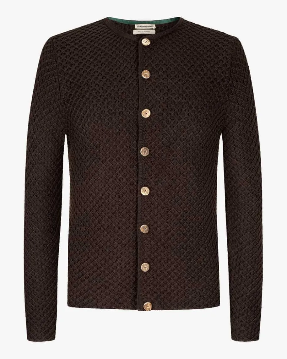 Xaver Trachten-Strickjacke für Herren von Gottseidank in Dunkelbraun. Tracht mitCharakter – Traditionelle Details sowie hochwertige Verarbeitung schaffen einmodernes Highlight für besondere Herren-Outfits. Zugleich untermalen rustikaleHornknöpfe sowie das Karo-Strickmuster gekonnt das Trachten-Design.