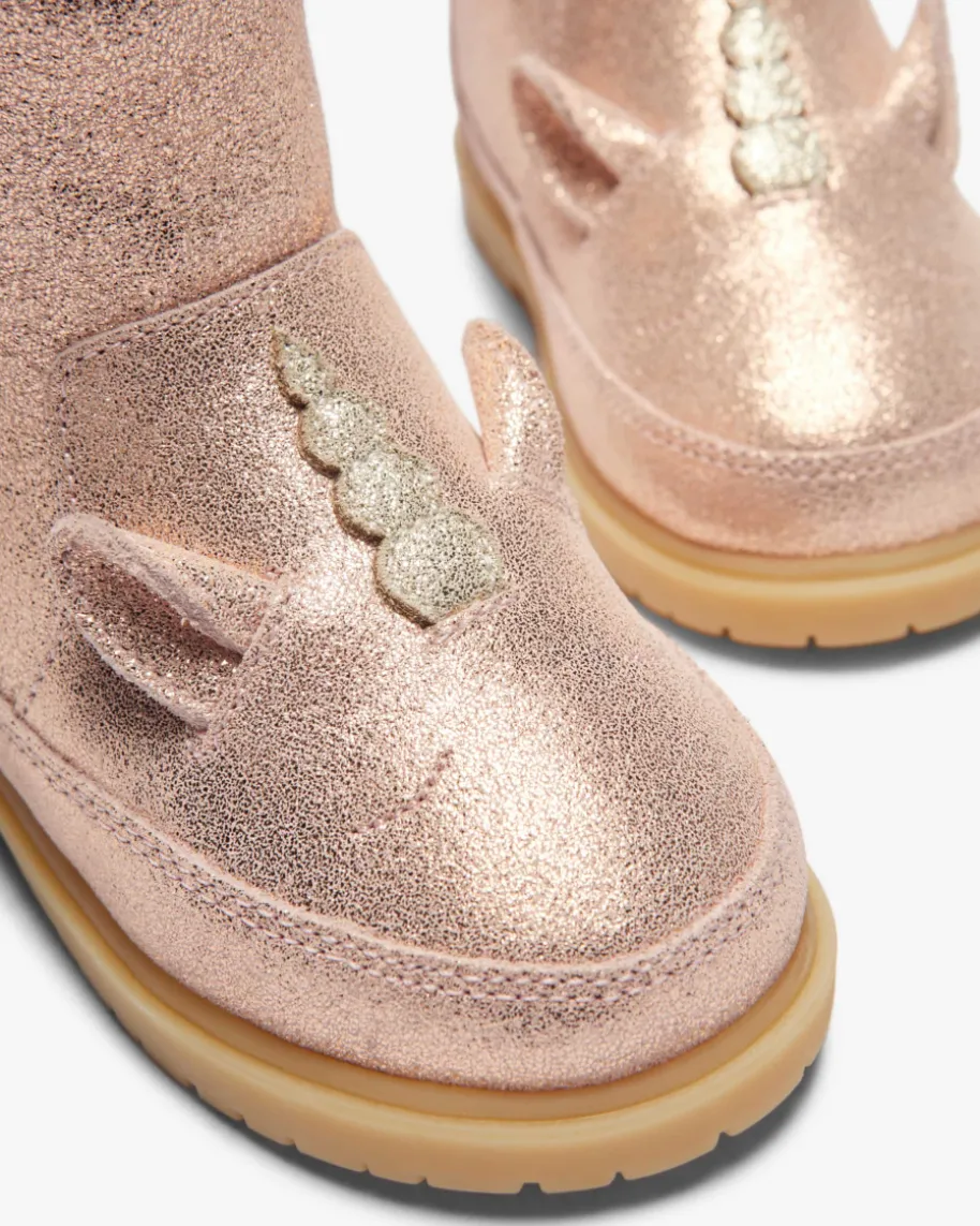 Xelly Einhorn Stiefel für Kinder von Donsje in Puder. Das Modell präsentiertsich dank der raffinierten Einhorn-Aufmachung als niedlicher Favorit für IhrenNachwuchs. Die glitzernde Leder-Qualität rundet das Gesamtbild gekonnt ab.