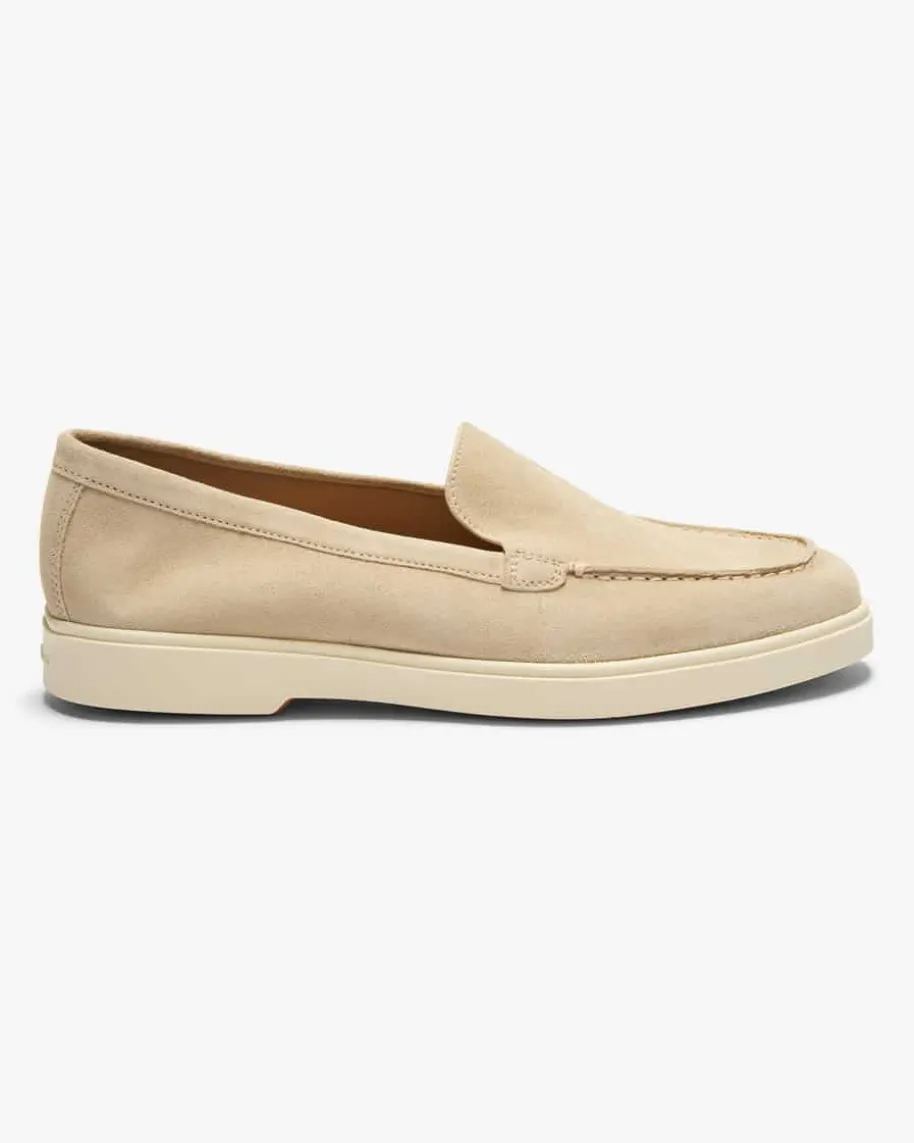 Yalta Low Loafer für Damen von Santoni in Beige. Das minimalistische Modellbegeistert dank der hochwertigen, soften Veloursleder-Verarbeitung sowie derlegeren Gummisohle sowohl mit edler Optik als auch mit hohem Tragekomfort undavanciert so zu einer modern interpretierten Loafer-Version.