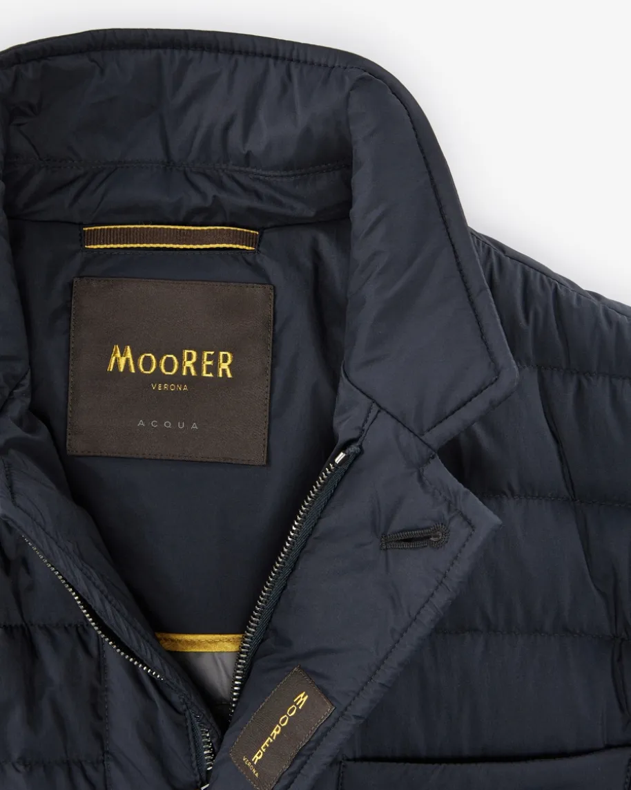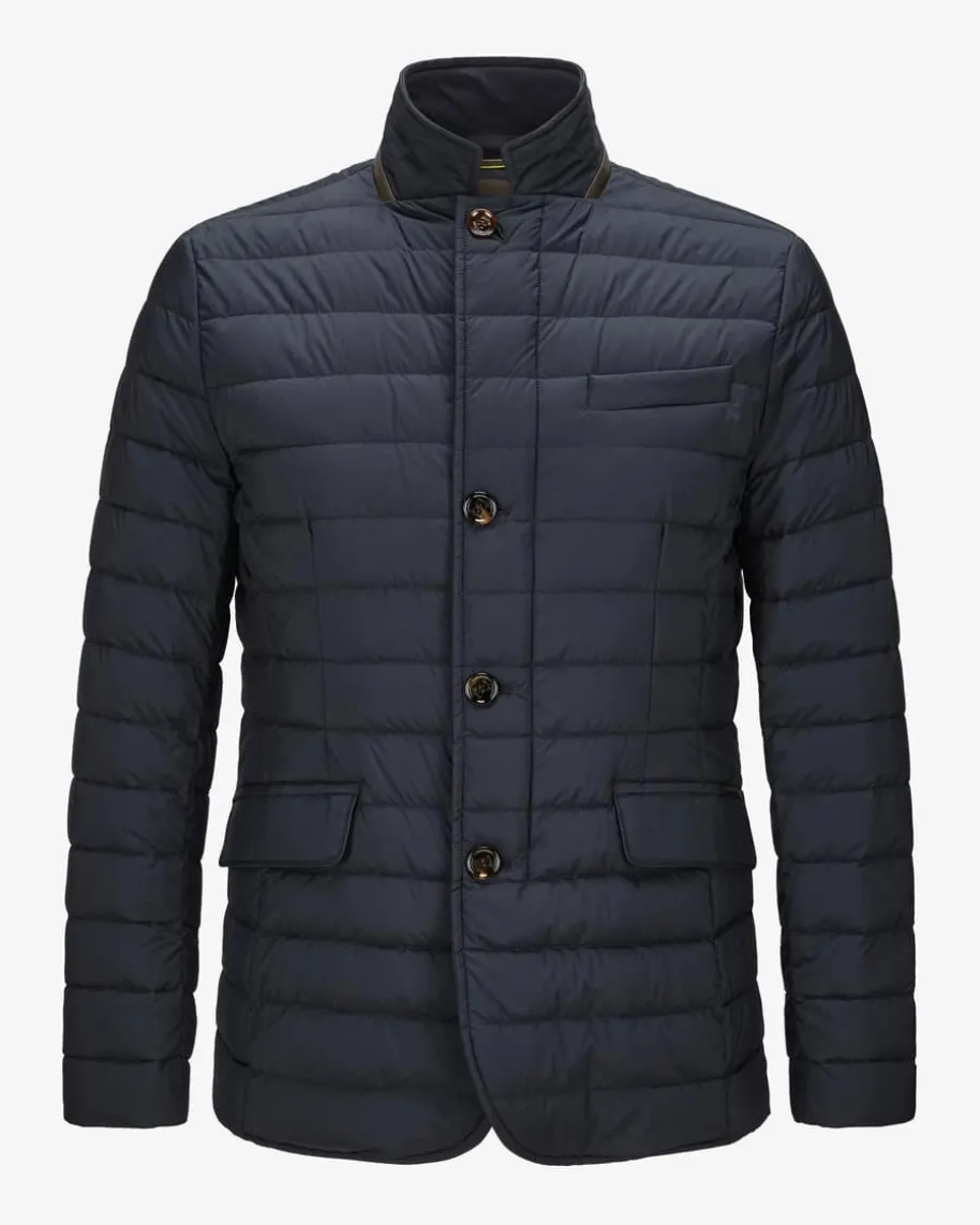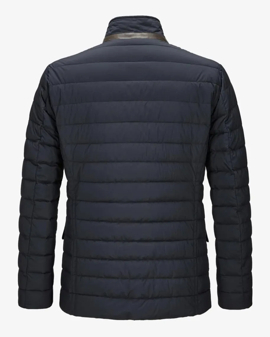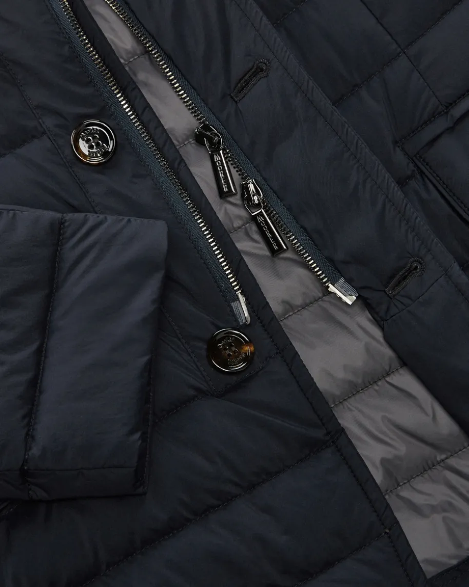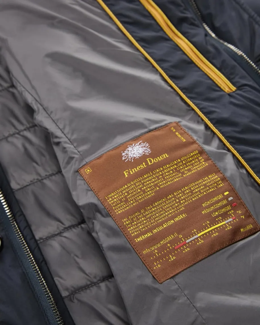 Zavyer Daunenjacke für Herren von Moorer in Navy. Made inItaly – Das imNorden Italiens ansässige Label steht für hochwertigeJacken, gefertigt ausfeinsten Materialien und jedes Design steht für denklassischen Mode-CharmeItaliens. Auch dieses Modell mit wärmeisolierendem Daunen-Futter spiegelt diePhilosophie des Labels gekonnt wider und erhält durch denLederbesatz luxuriöseAkzente.