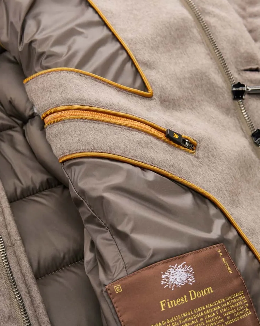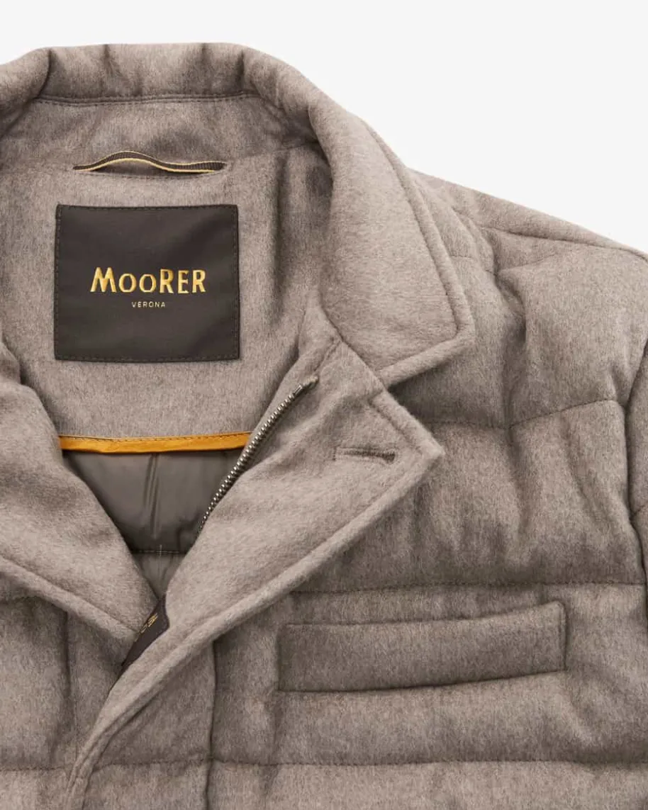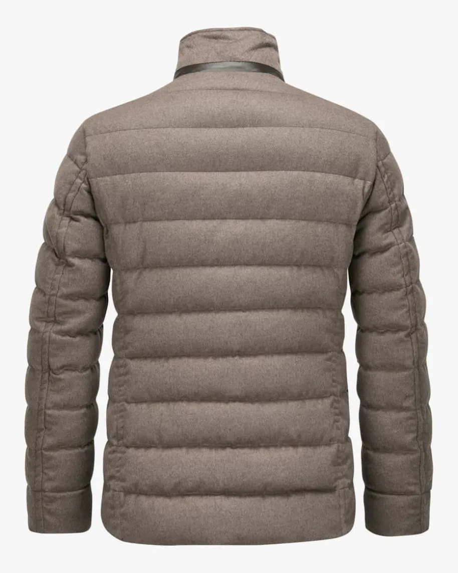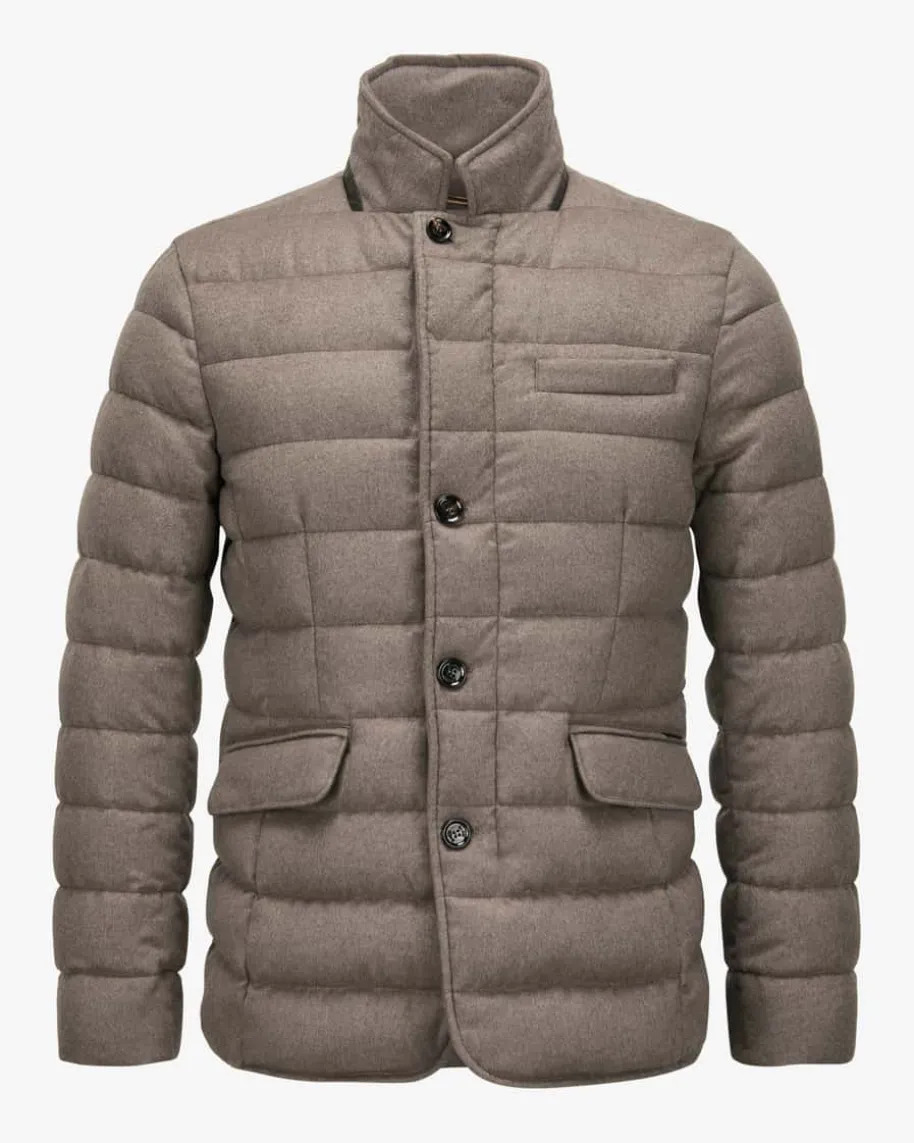 Zayn Daunenjacke für Herren von Moorer in Taupe. Das gesteppte Modell aus feinerWoll-Qualität sowie wärmender Daunenfüllung überzeugt mit klassischem Design undleicht taillierter Passform, während der raffinierte Stehkragen mit Leder-Besatzden Look stilvoll ergänzt.