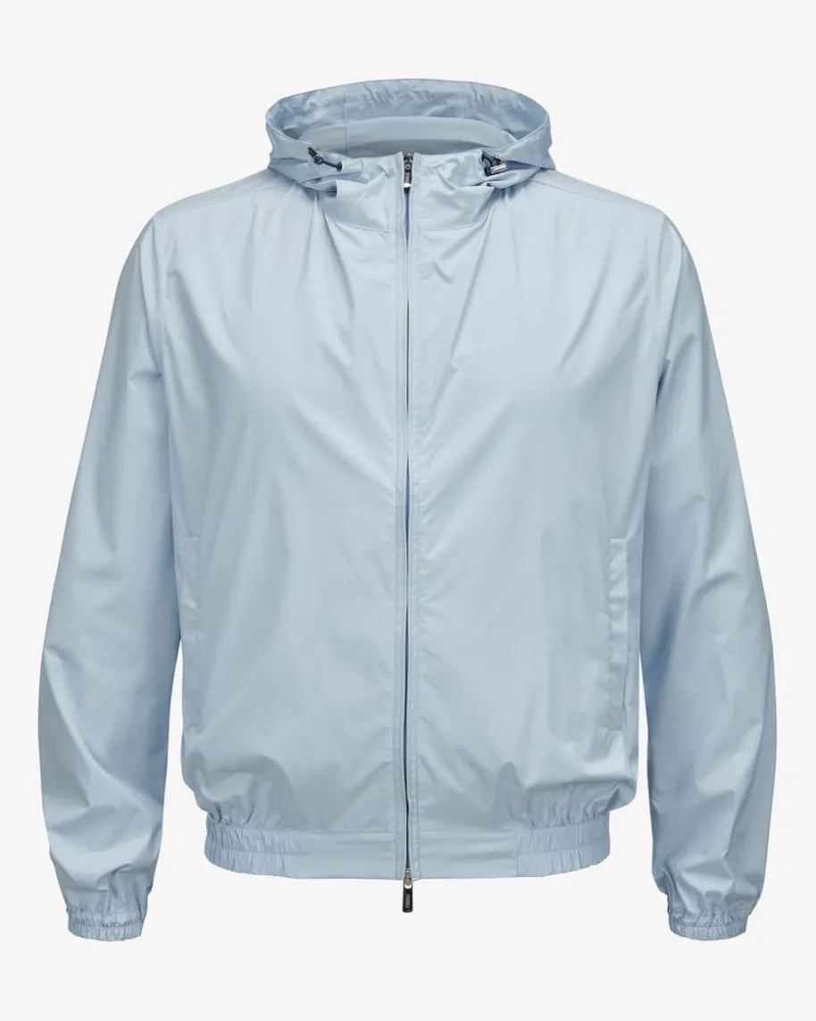 Zoom Jacke für Herren von Fedeli in Hellblau. Das Modell präsentiert sich mitbesonders leichter Material-Qualität mit Airstop-Ausrüstung, die für angenehmenTragekomfort sorgt. Die sportive Silhouette mit elastischen Bündchen und Kapuzerundet den legeren Style gekonnt ab.