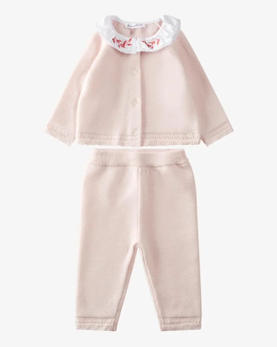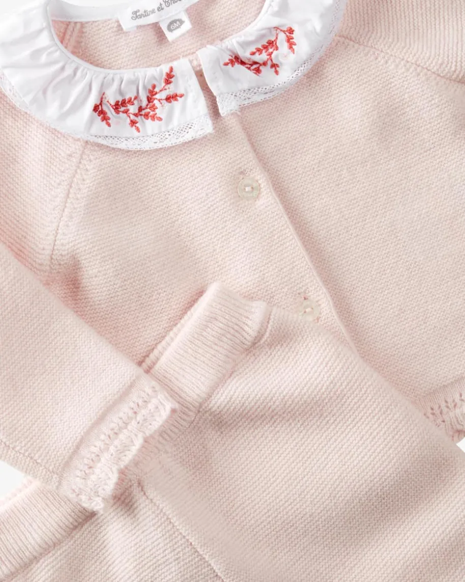 Zweiteiler für Mädchen von Tartine et Chocolat in Rosa. Dieses Strick-Set erhältdank der hochwertigen Woll-Cashmere-Qualität eine angenehme Haptik und besondereStruktur, während der Kragen-Besatz mit floralen Stickereien den Look niedlichvollendet.