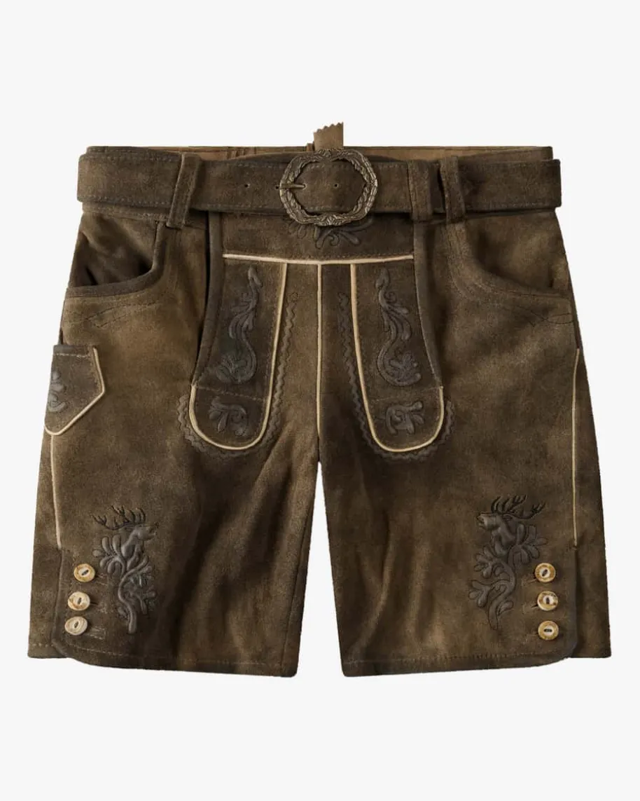 Achill Lederhose kurz für Jungen von Spieth & Wensky in Braun. Die Mini-Tracht zeichnet sich durch die hochwertige Leder-Verarbeitung aus, währendstilvolle Relief-Stickereien als auch rustikale Hornknöpfe den traditionellenLook gekonnt in Szene setzen.