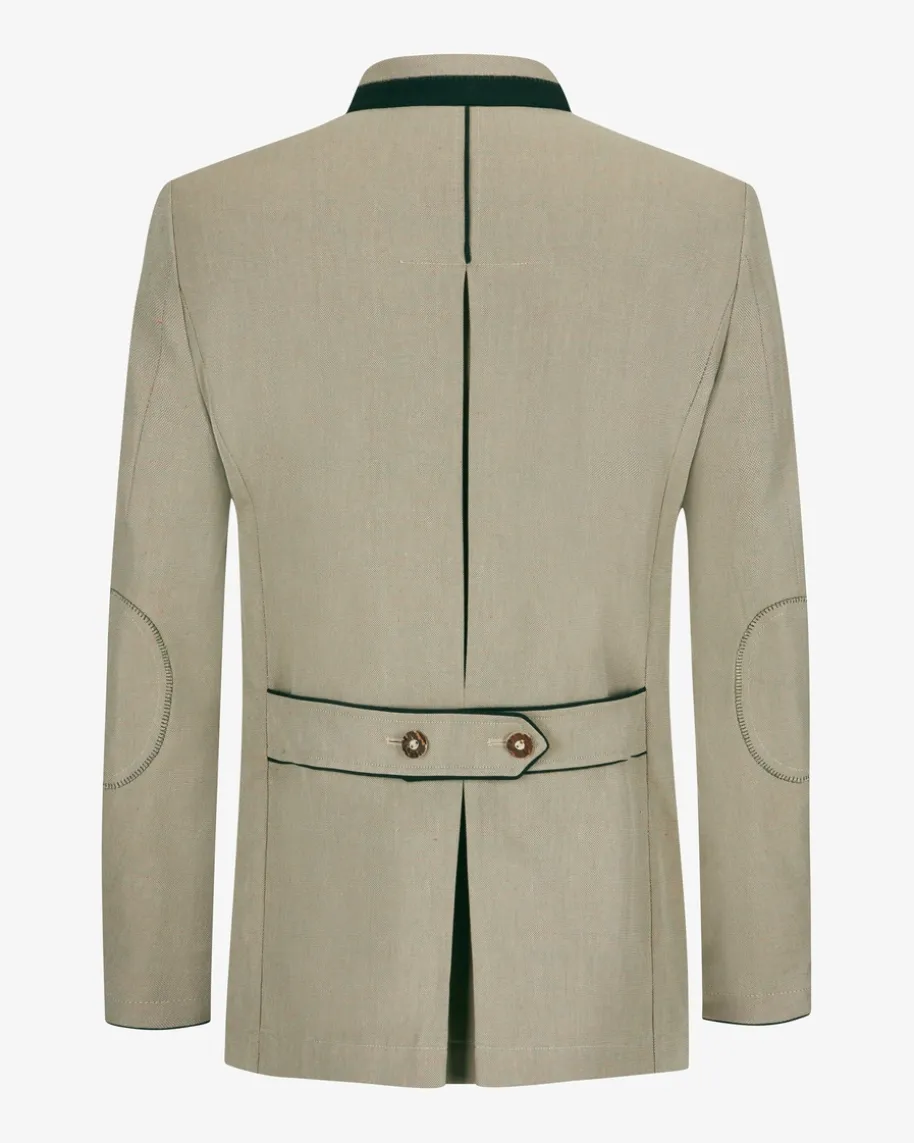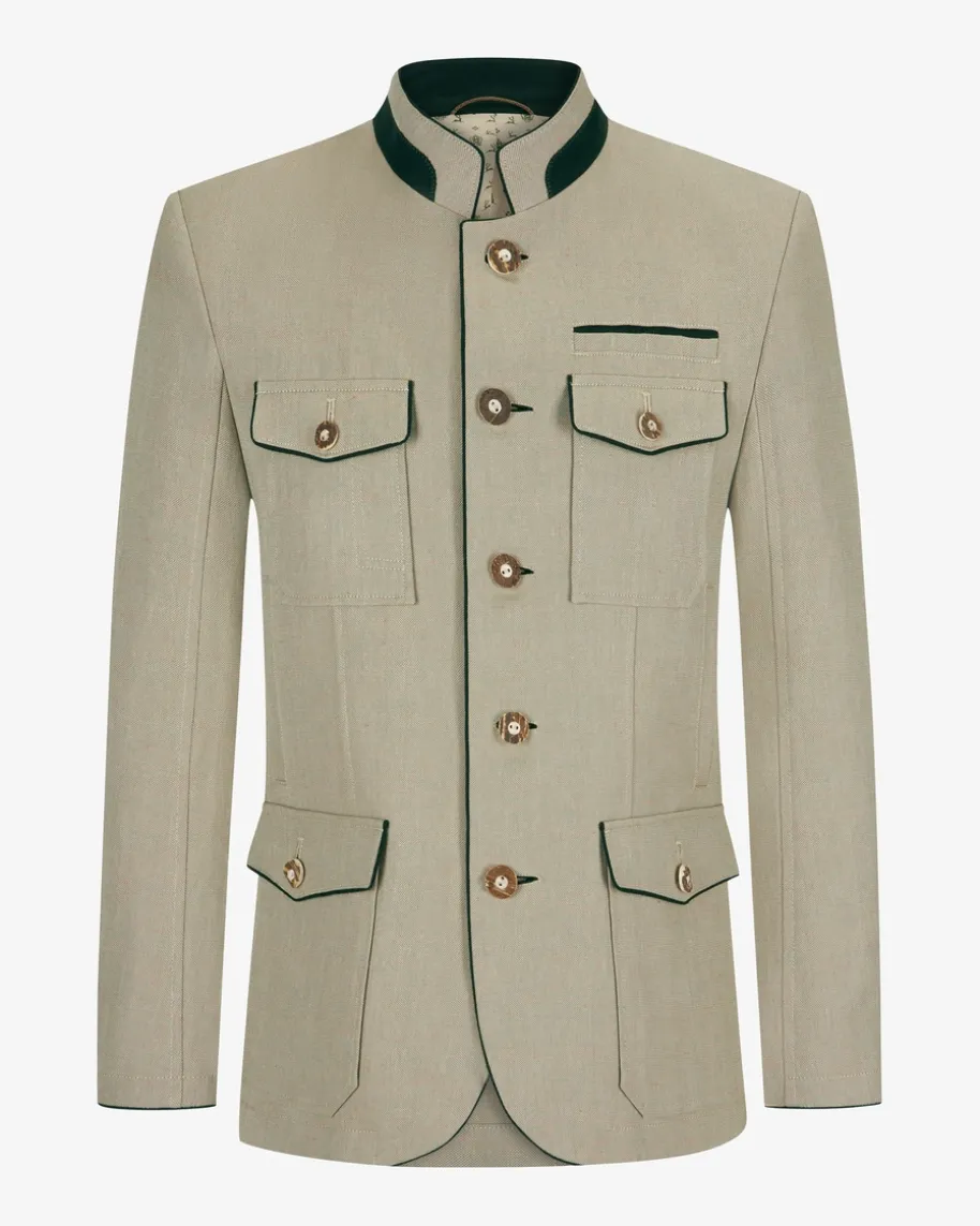 Adrian Trachten-Janker für Herren von Habsburg in Schilf. Dank Taillenabnähernerhält das traditionelle Modell eine maskuline Passform. Auf der Rückseitebefinden sich eine aufspringende Falte sowie ein Zierriegel, während derraffinierte Stehkragen und die traditionellen Hornknöpfe das klassische Designabrunden.