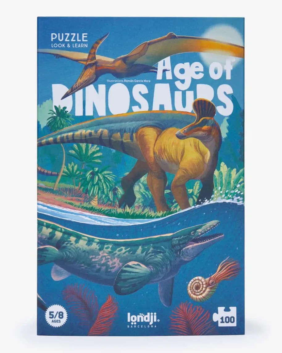 Age of Dinsoaurs Puzzle in Bunt. Dieses Puzzle kombiniert lustigen Rätsel-Spaßmit informativen Fakten über Dinosaurier. Mit dem „Look & Learn“-Modellverstecken sich hinter jedem Uhrzeit-Giganten Informationen über Größe,Ernährung und Gewicht.