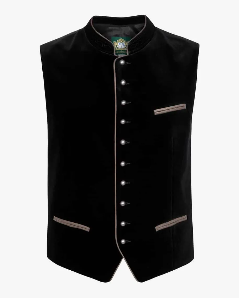 Albrecht Trachtenweste für Herren von Hammerschmid in Schwarz. Weiches Samtan der Vorderseite, der zeitlose Schnitt sowie die filigranen Stickereien amStehkragen machen die Weste zum stilsicheren Begleiter zur Lederhose.